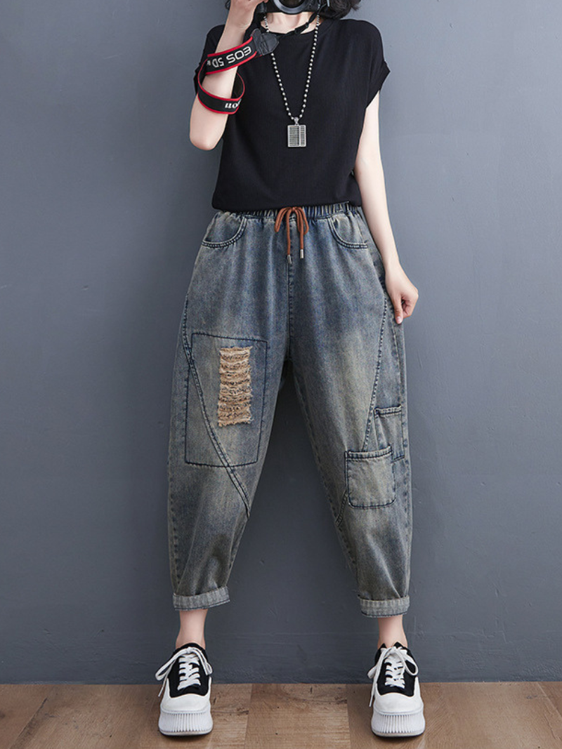 These harem pants are made from high-quality denim material. which is both durable and comfortable to wear. The pants come in a classic blue color that can be easily paired with a variety of tops and shoes.The bottom of the pants has a straight leg design. which adds a touch of elegance and sophistication to the overall look. With a high waist design. they provide a flattering and comfortable fit for the wearer. The harem pants feature a unique and trendy style. which is perfect for those who want to stand out in their fashion choices. Available in sizes S. M. L. and XL. these pants can fit a range of body types and sizes. Whether dressed up or down. these harem pants are a versatile and stylish addition to any wardrobe.