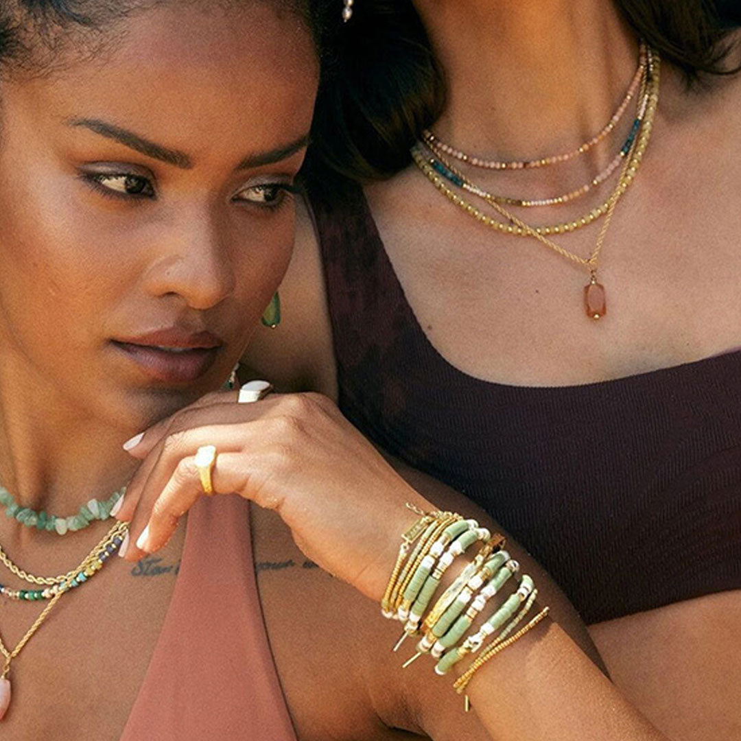 A simple yet special bracelet stands beautifully alone. Crafted from plated alloy blend and polymer clay. embellished with rondelle seeds. featuring a stretchy fit with elastic strings that are easy to slip on. and gold-tone disc spacers with heishi-shaped beads. The white one is adorned specially with turquoise magnesites. Find more unique bracelets and trendy jewelry in our boutique. and pair it with a blouse or dress to let its scattered style shine.