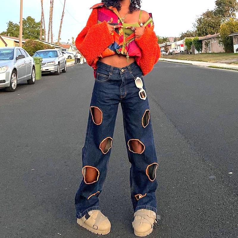This pair of jeans features a casual low waistline and baggy hip holes for an on-trend. laid-back look. Straight-leg design offers a classic. timeless silhouette. while shoulder-to-hem tapered stitching ensures a flattering fit. Durable. thick-stitched fabric offers superior mobility and comfort.