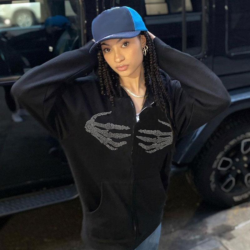 This hoodie would look equally cool with everything. Made of cotton blend and polyester. embellished with sparkly gem skeleton graphics at breast. featuring a loose fit cut structured with a drawstring hoody. a front zipper fastening. patch pockets at sides and a regular length trimmed with the ribbed hem. Find more trendy women's hoodies or clothing in our boutique and pair perfectly with a pair of slouchy joggers or slim pants.