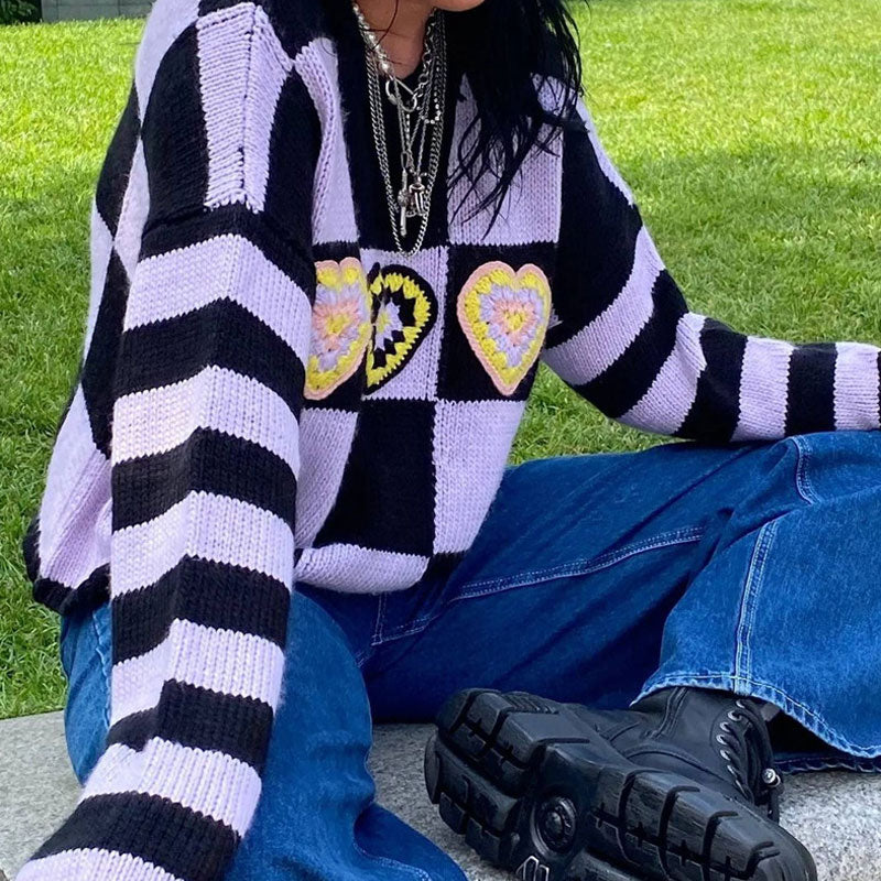 Be a sight for sore eyes in this super chic high-neck gingham sweater. Crafted with blend acrylic and rib knit. stand out in contrasting colorblocks allover adorned with checks and stripes. featuring three crocheting heart patterns at the front. a crew neckline followed with dropped shoulders. a pullover styling structured with long sleeves. a relaxed silhouette trimmed with ribbed edges. ending up with a regular length. Find more unique women's plaid sweaters or trendy clothing in our boutique. and team it with a pair of harem pants for a stylish winter look.