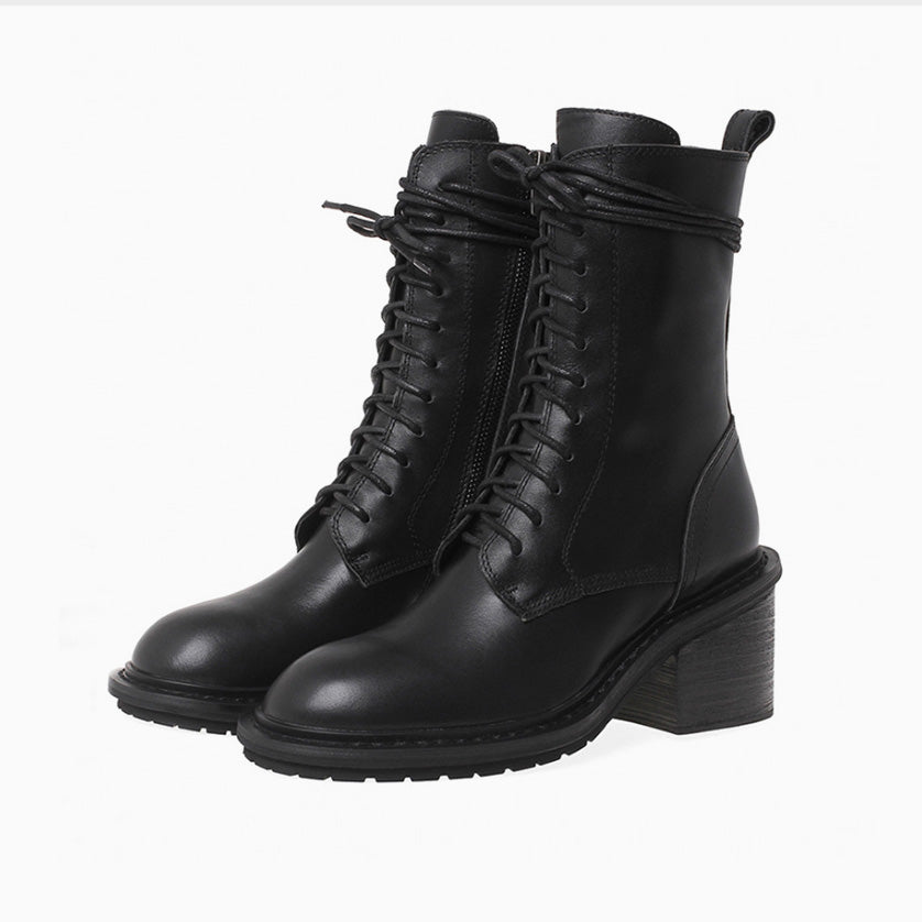 This pair of slim fit combat boots is a wintertime classic. Crafted with PU leather and rubber. embellished with elongated lace-up straps around. featuring a mid-calf height topline presented in solid black. a round toe styling tailored with a zipped fastening to one side. and grounded on anti-slip chunky rubber heel. Find more trendy women's boots and unique shoes in our boutique. and pair the stylish boots well with tea dresses and denim alike for a cool street look- Heel height:8 cm.