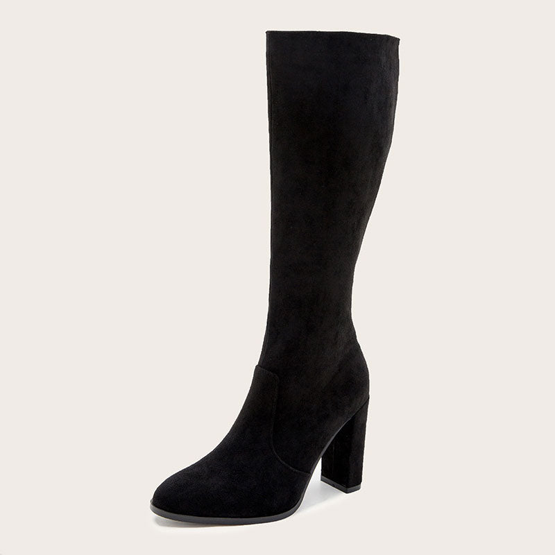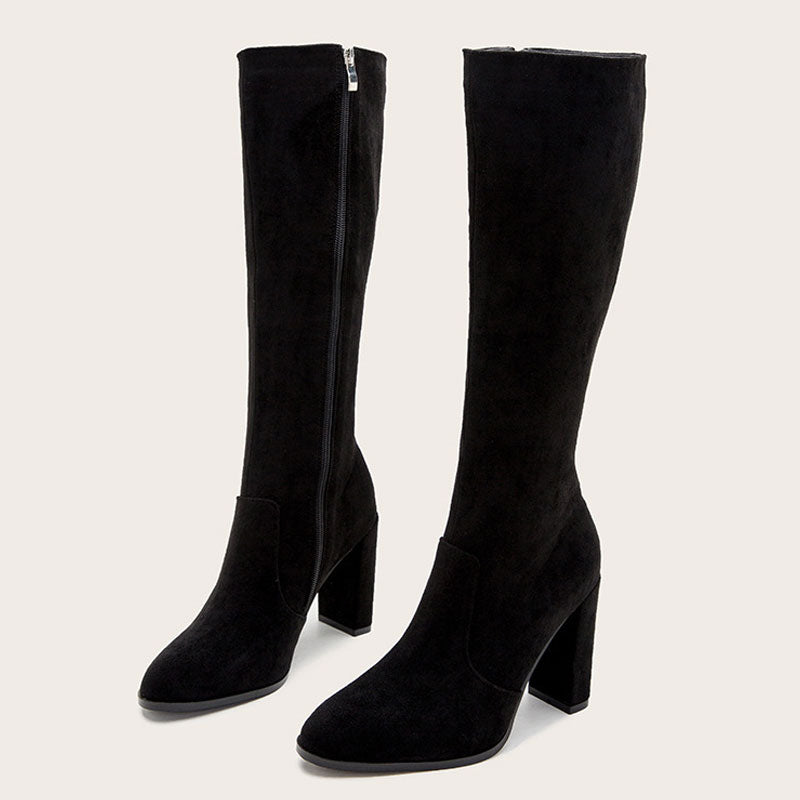 Classic Pointed Toe Chunky High Heel Suede Knee High Boots - Black