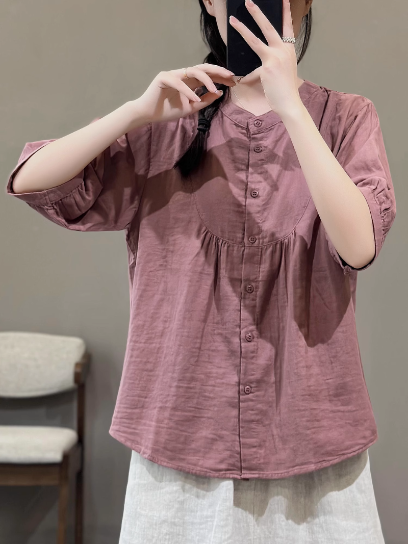 Women's Tops. crafted with high-quality 100% cotton material for ultimate comfort. The tops feature a classic solid color pattern. perfect for any occasion. With a regular length and half sleeves. they provide a stylish and relaxed fit. Available in an array of stunning colors including green. bean paste pink. white. violet. purple. and blue. Size details for M and L include length ranging from 62 to 66cm. bust size of 102cm. and sleeves measuring 29cm for M; and length ranging from 64 to 68cm. bust size of 104cm. and sleeves measuring 30cm for L. Elevate your wardrobe with these fashionable and versatile tops.