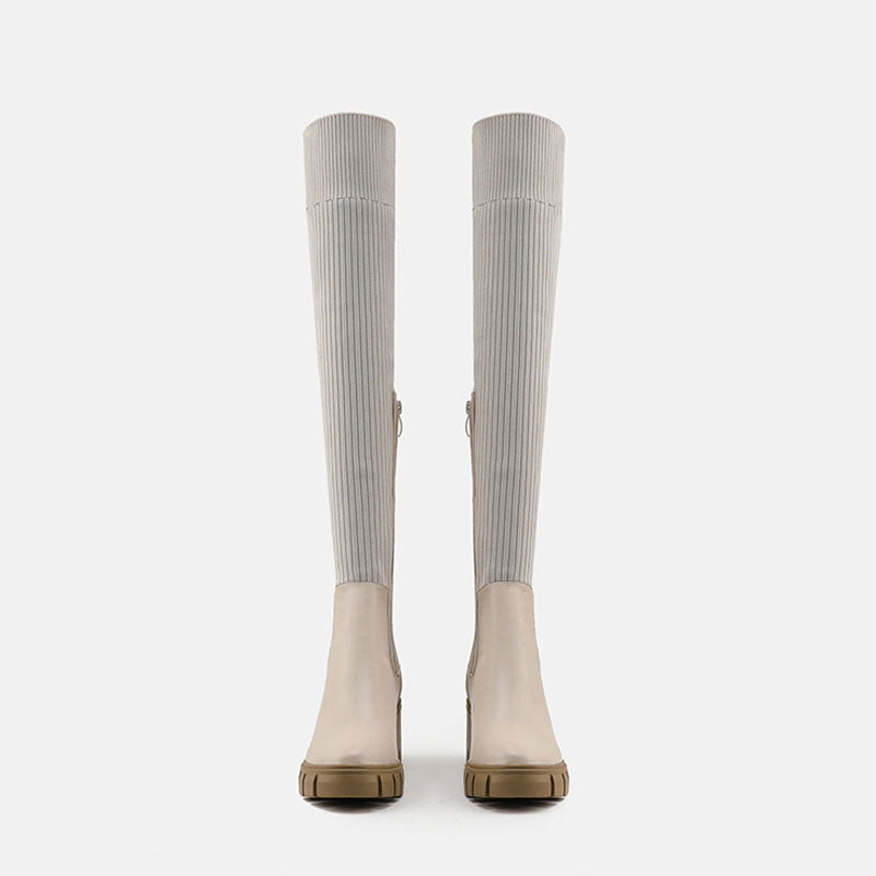 Contrast Panel Trim Lug Sole Chunky Heel Knit Knee High Sock Boots - Apricot