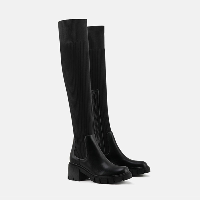 The knee-high boots are going to quickly become your go-to pair! Crafted with ribbed knit. rubber and PU leather. stand out in a panelled contrasting design. featuring a round toe enhanced by a faux leather upper. a lightly cushioned footbed followed by a ridged outsole. a ribbed knitted stretchy shaft trimmed with a half-zip closure at side and chevron pattern at back. ending with a sturdy rubber heel. Find more trendy women's lug-sole boots and unique shoes in our boutique. and wear them on with a sweater mini dress and a shoulder bag - Heel height: 6cm.