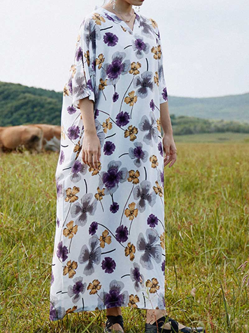Crafted from pure cotton. this beautiful kaftan dress features a vibrant floral print in a myriad of colors. The loose-fitting silhouette is accentuated by a V-neckline and billowing half sleeves. making it the perfect choice for warm days. Team it with sandals and a wide-brimmed hat for a chic bohemian look.