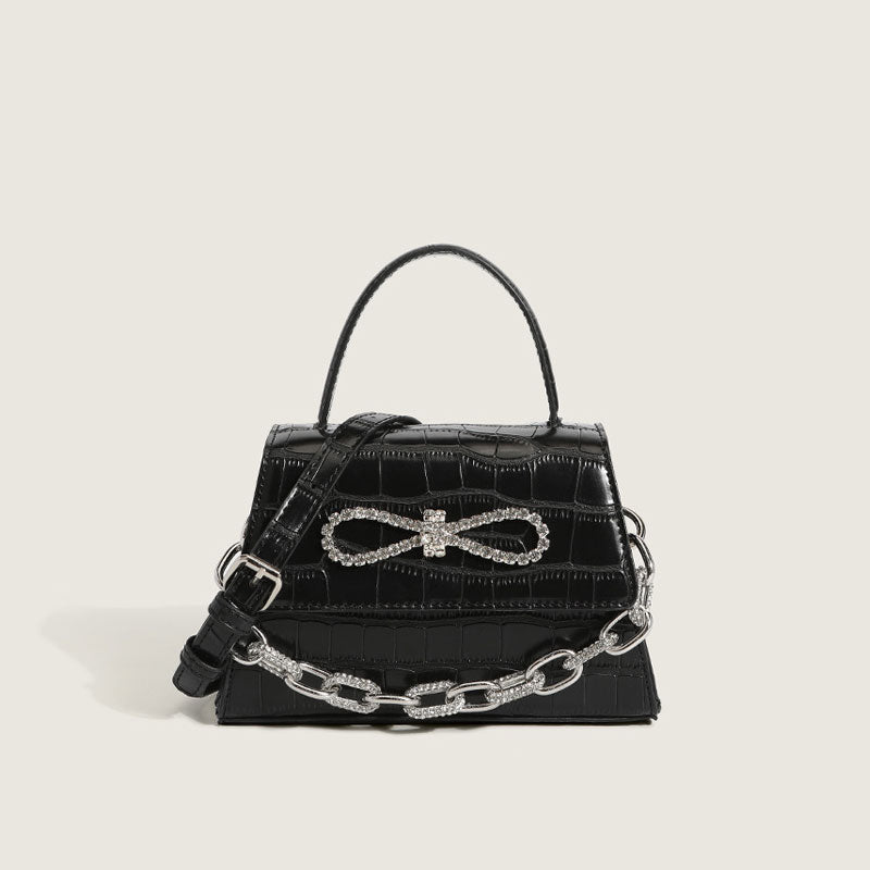 Don't forget this stylish crystal handbag as you head out for the day! Crafted with patent leather and blend alloy. stand out in a bow-knot detail accented with shiny rhinestones. featuring a sculptural top handle. a foldover top designed with a magnetic closure. a chunky chain beaded with sparkly gemstones. a roomy inner structured with an interior zipper pocket. textured crocodile patterns throughout. a boxy silhouette finished with an adjustable yet removable shoulder strap. Find more trendy women's embossed bags or unique bags in our boutique. and style it with a little black dress for an attention-seeking look.