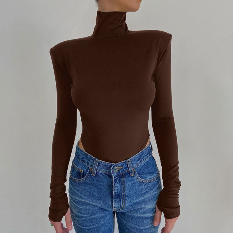 This coffee bodysuit is a sexy-effect piece of your new-season ensembles. Made of blend cotton. embellished with an alluring cut-out design at the rear. featuring a high neck in body skimming silhouette. high leg styling covered in thong fit to the rear. stretchy long sleeves tailored with thumbholes. and snap-button closures finished at the bottom. Find more trendy women's bodysuits or chic clothing in our boutique. and layer it with flared pants or high waist jeans for a unique sexy look.