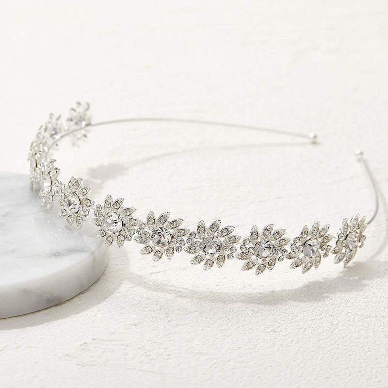 This sparkly headband brings a bit of dazzle in your evening look. Made of silver-plated hardware fabric. embellished with its dazzling rhinestones encrusted surface. featuring a circular cut shaped sleek band along with flower motifs and finished with a flexible slip-on style. Find more trendy women's headbands or unique hair accessories in our boutique. and style it for a classic look.