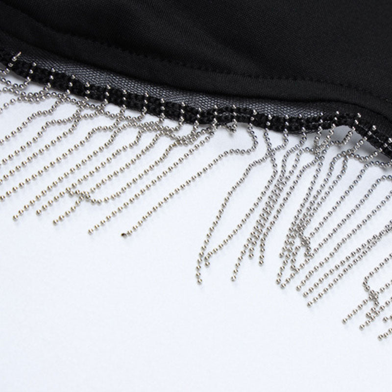 Be the breathtaking beauty of the night by getting your hands on this enchanting tasseled skirt matching set. Crafted with blend acrylic. polyester and elastane. stand out in silver-tone fringes at the edges. featuring a crew neckline along with fitted sleeves. a slip-on styling finished with a short length. and complete a minimalist two piece set with a slim-fit mini skirt in a short length. a pullover styling. Find more unique women's solid-color matching sets or trendy clothing in our boutique. and pick a pair of high heels for an attention-seeking look.