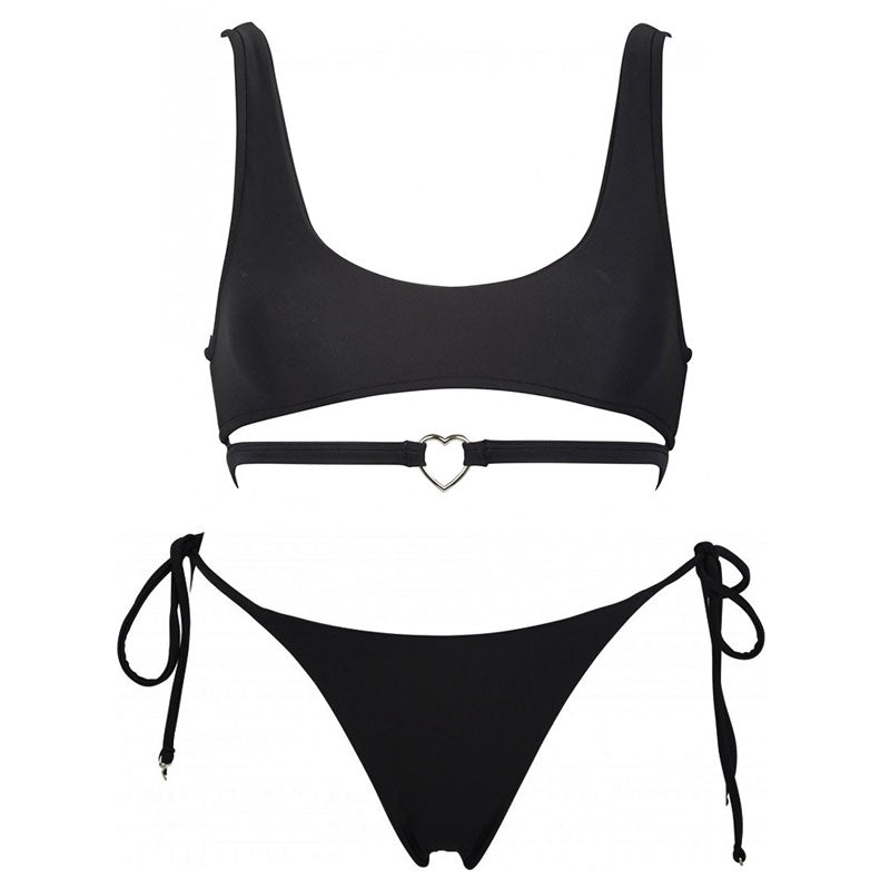 Fall in Love Metal Heart Tie String Bralette Bikini Set - Black