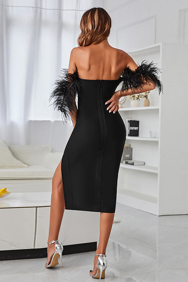 Let the night be all about you looking chic in the Feather Trim Off-Shoulder Split Dress. Comfy bandage fabric. off-shoulder design. feathered embellishment. and this midi has a side slit all make for a stylish and sexy look. Accessorize with sparkly accessories and stiletto heels to get out and about.