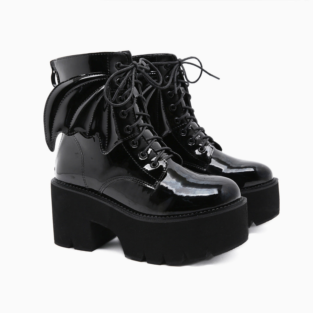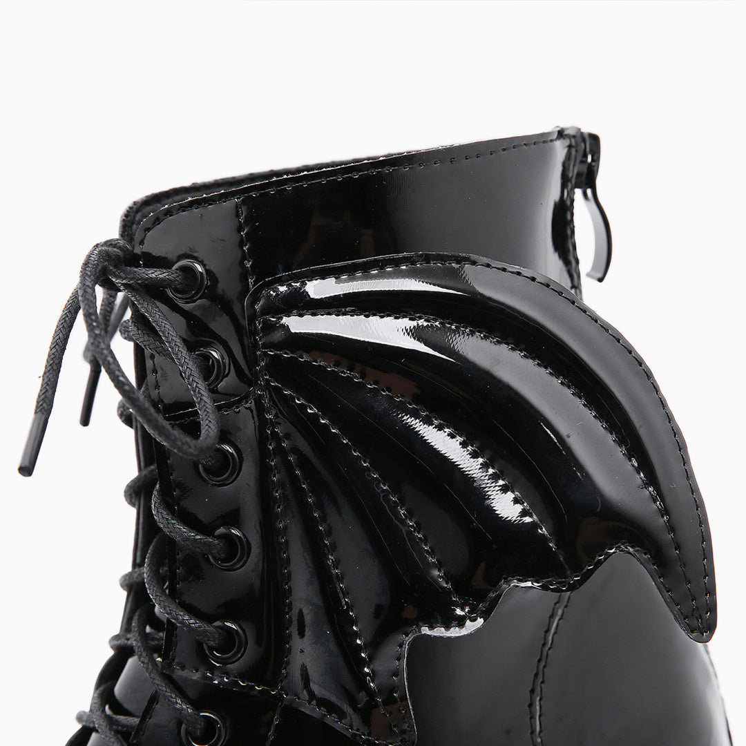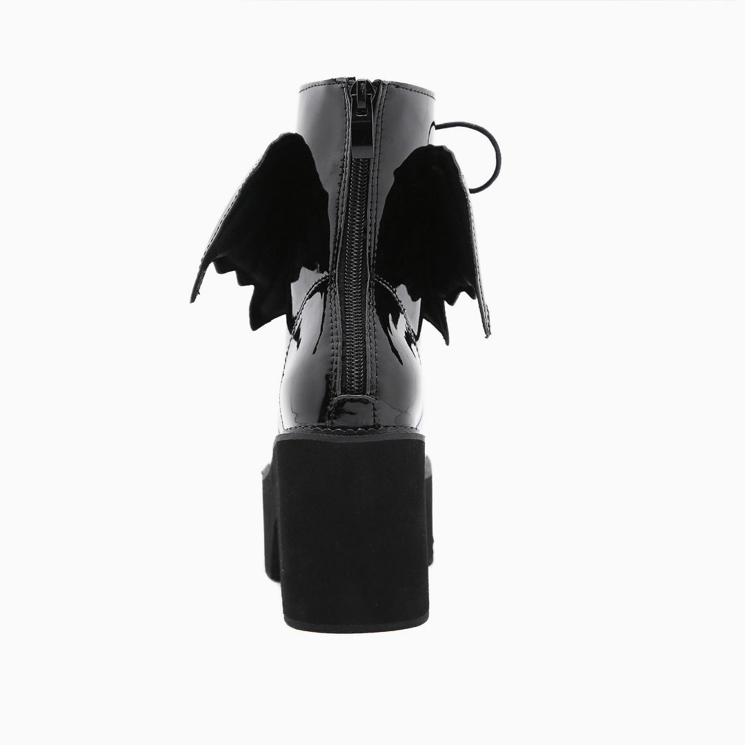 This pair of ankle boots adds a fun take to the classic block heel styling. Crafted with PU leather and rubber. embellished with flying wings to the sides. featuring an ankle-height topline tailored with a zip fastening to the rear. a round toe styling along with lace-up closure at the vamp. and grounded on extra thick. serrated lug rubber soles. Find more trendy women's boots and unique shoes in our boutique. and go with crop-length jeans or skirts for a funny look- Heel height: 8.5 cm.