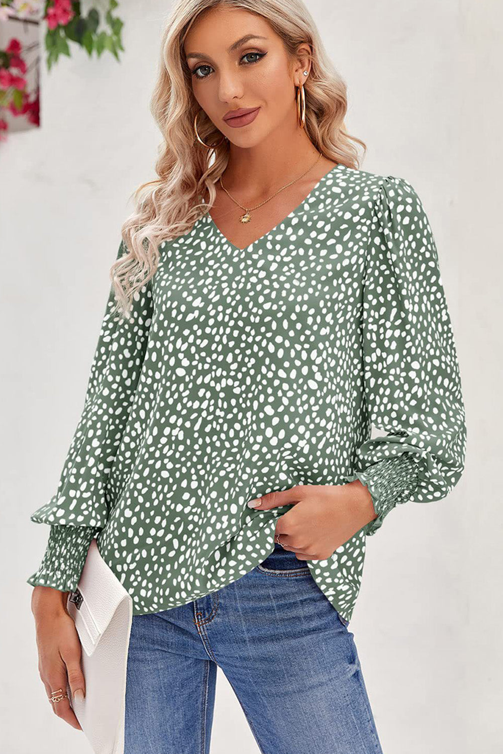 Introducing the Green Spotted Pattern Shirred Cuffs Bubble Sleeve Blouse—a must-have. fashion-forward addition to your wardrobe. Made from 100% Cotton. this blouse promises comfort and durability. featuring a lively green spotted pattern and bubble sleeves with shirred cuffs.