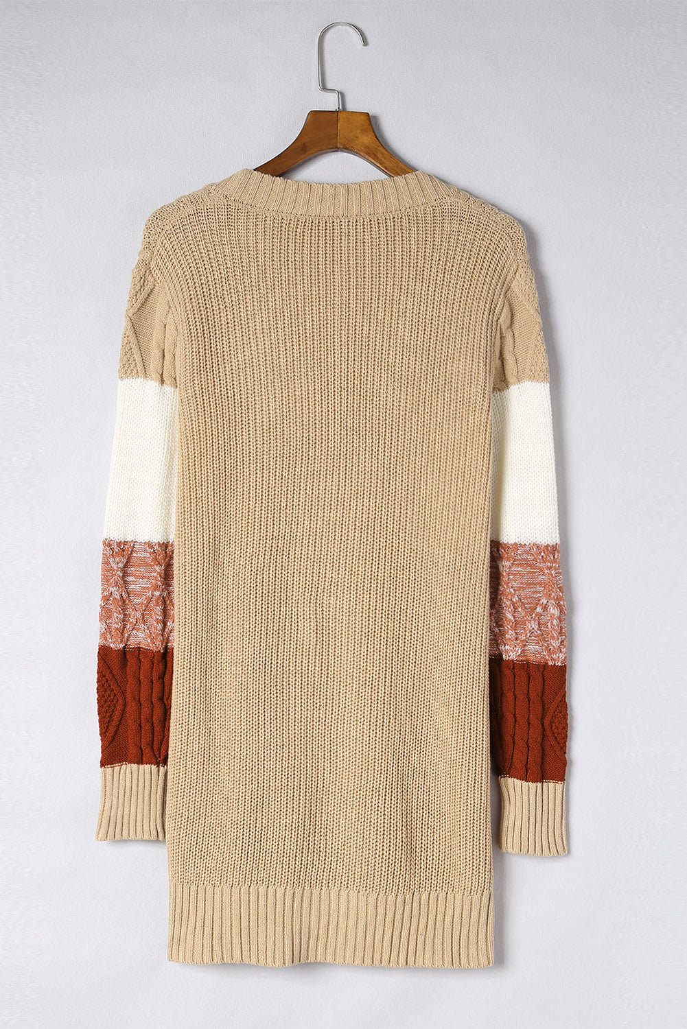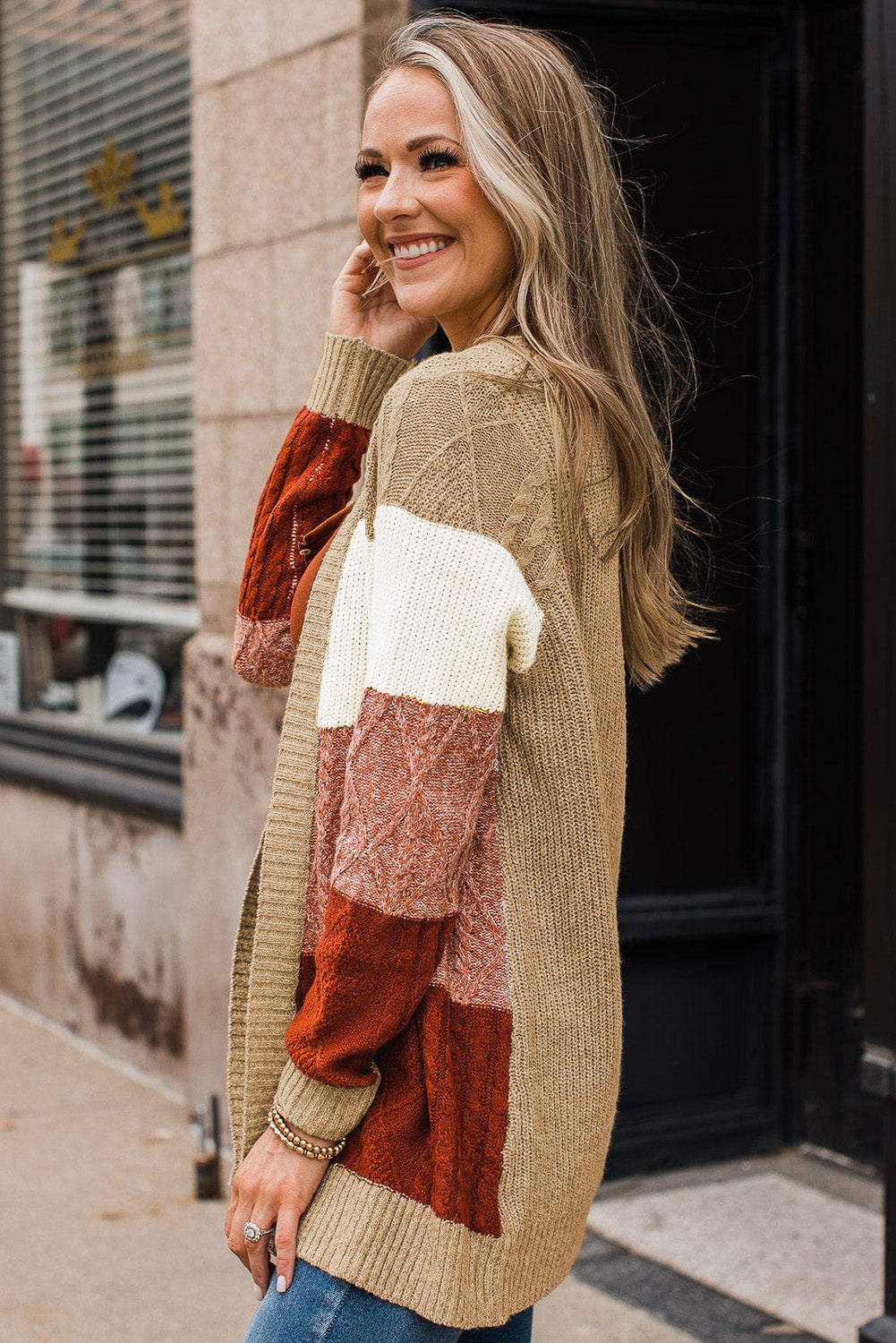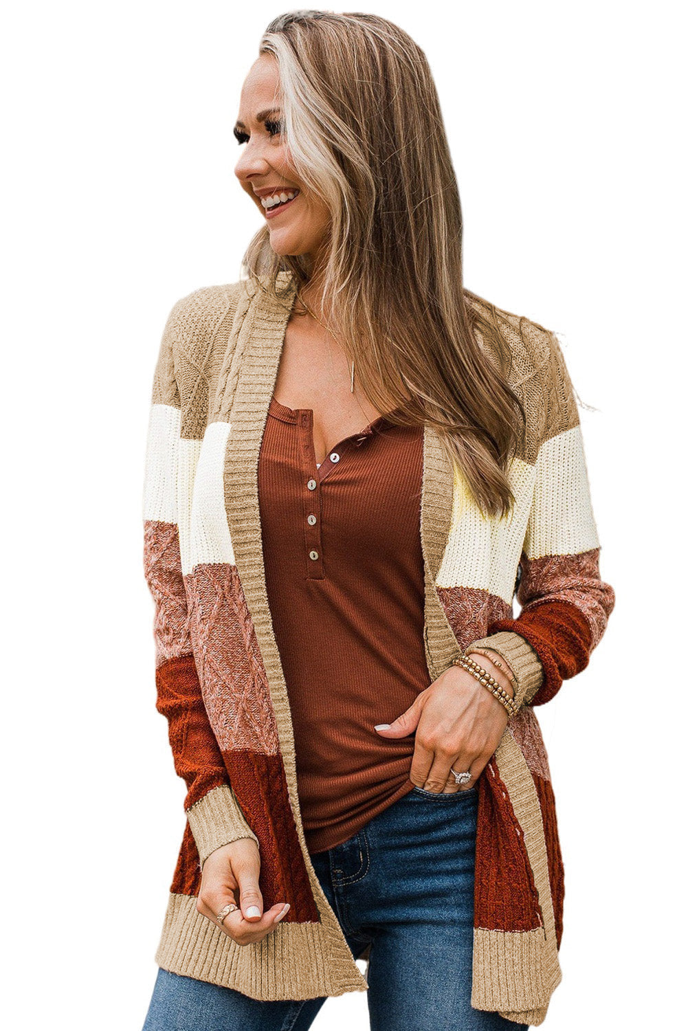 Shop now and add a touch of style to your wardrobe with the Khaki Color Block Long Sleeve Open Front Cardigan Sweater.