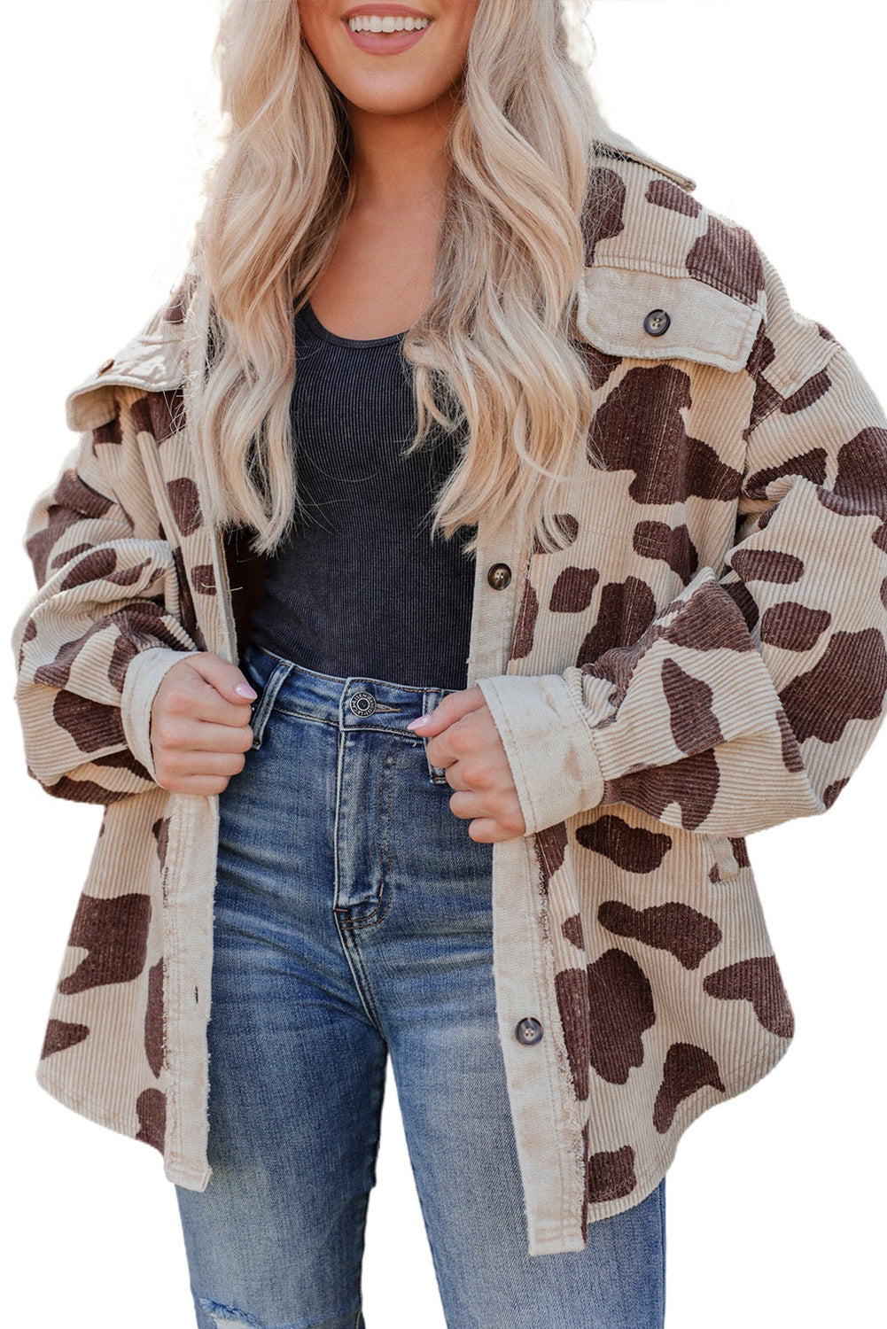 Stay ahead of the trends with this stylish Khaki Cow Spots Printed Corduroy Shacket. featuring a unique all-over cow spots pattern!