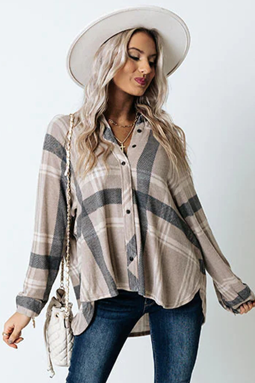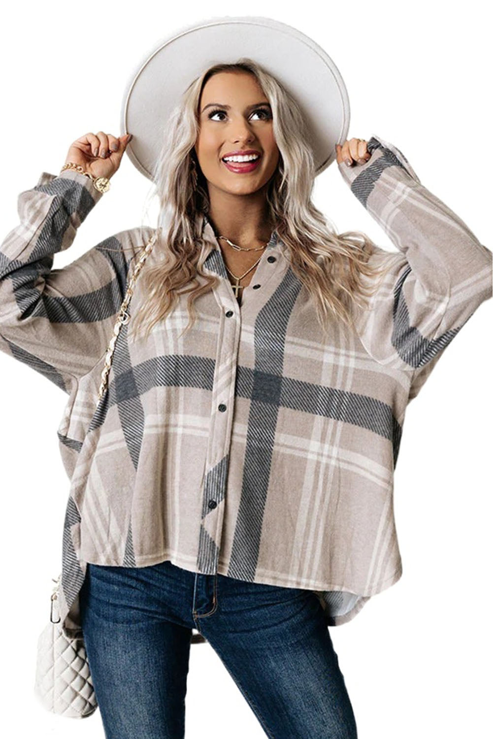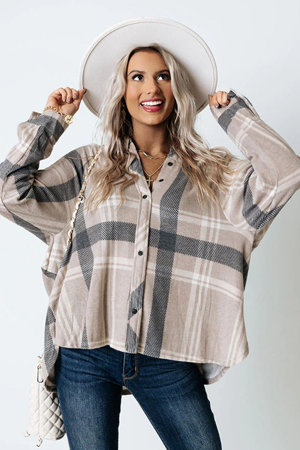 Introducing the Khaki High Low Brushed Plaid Oversize Shacket. the perfect addition to your wardrobe.