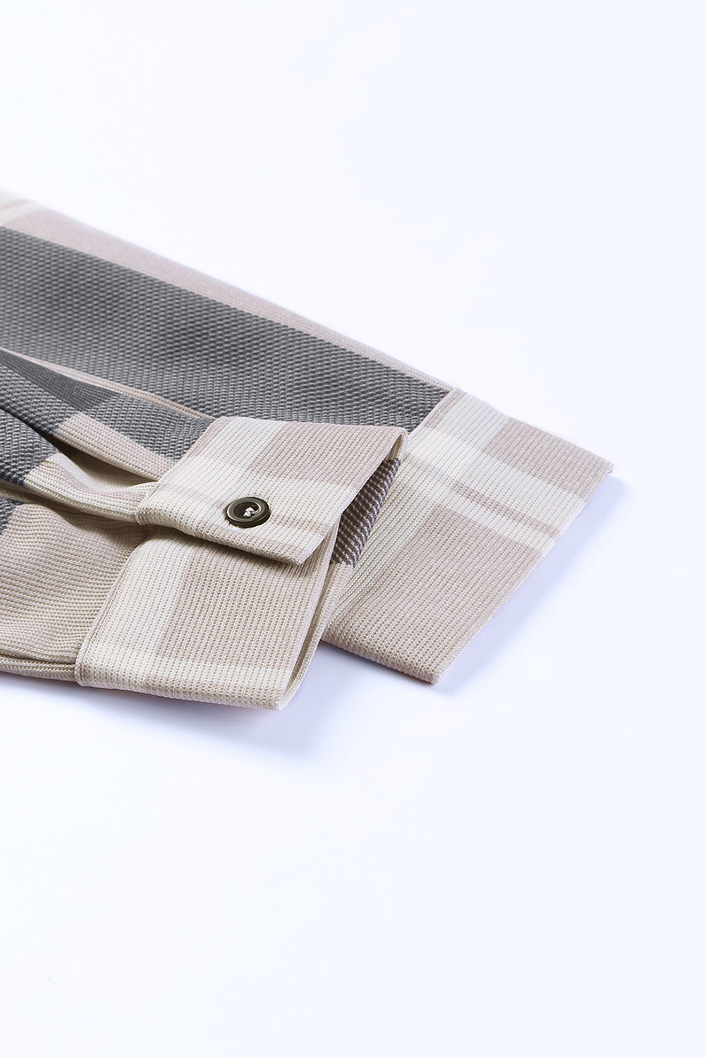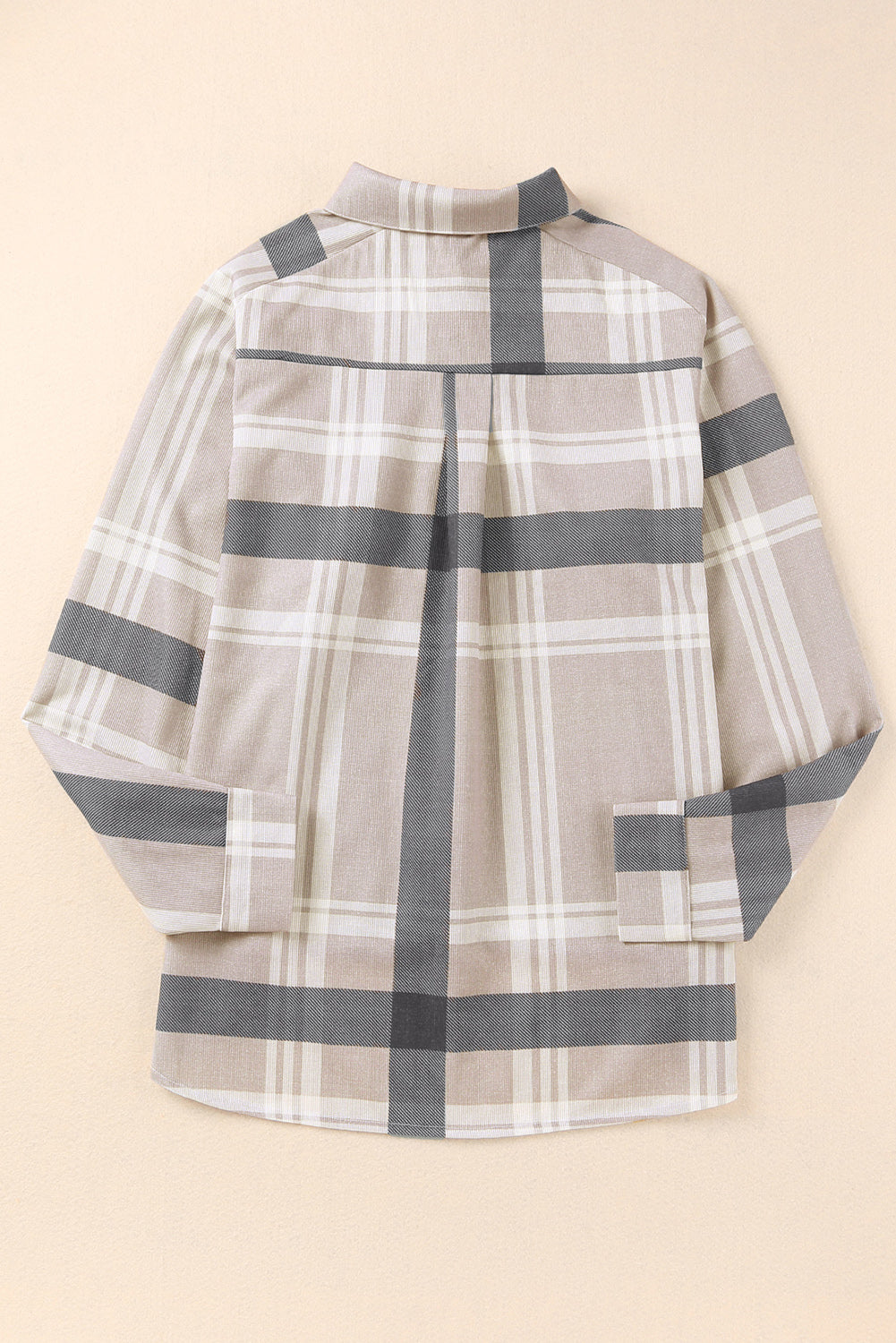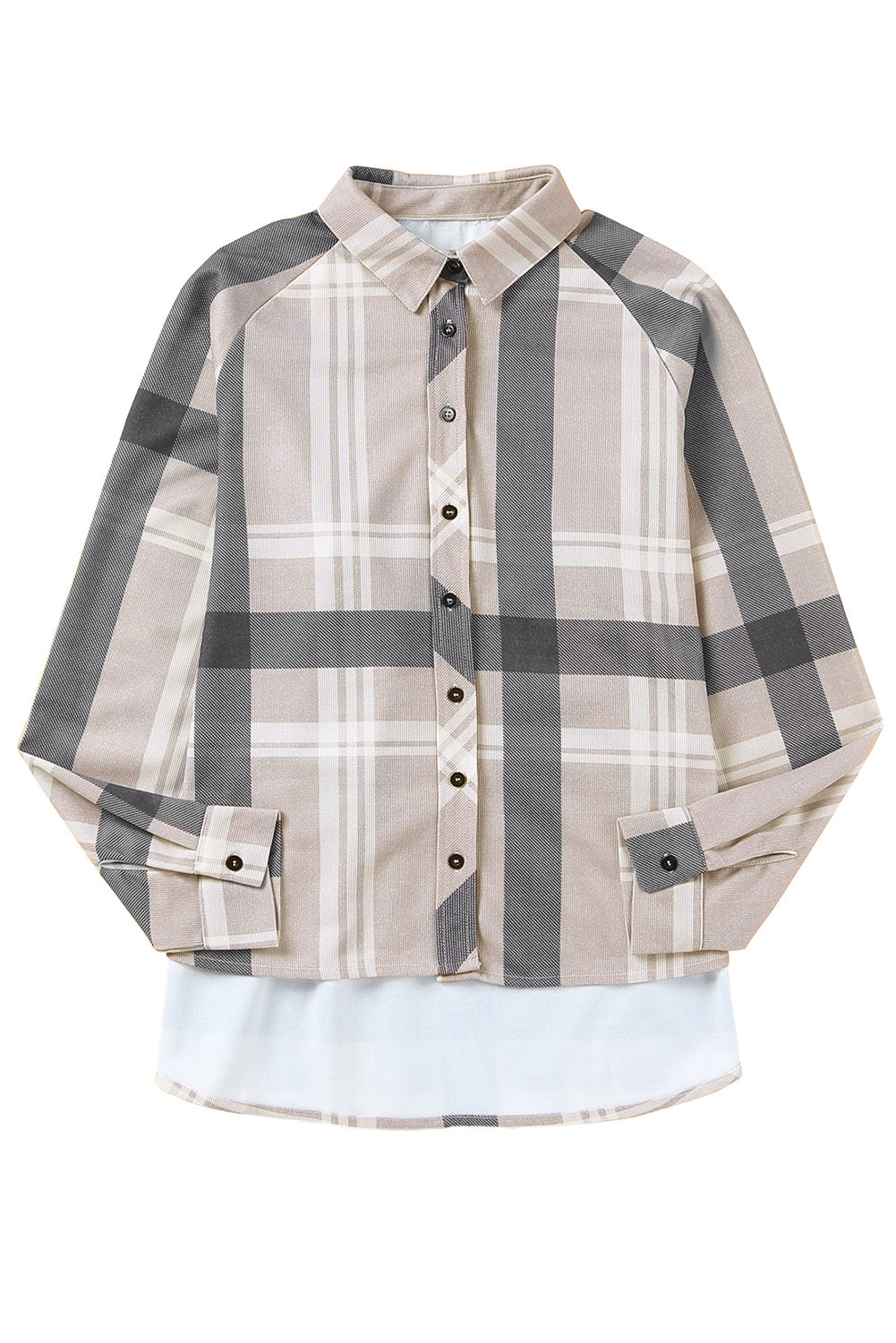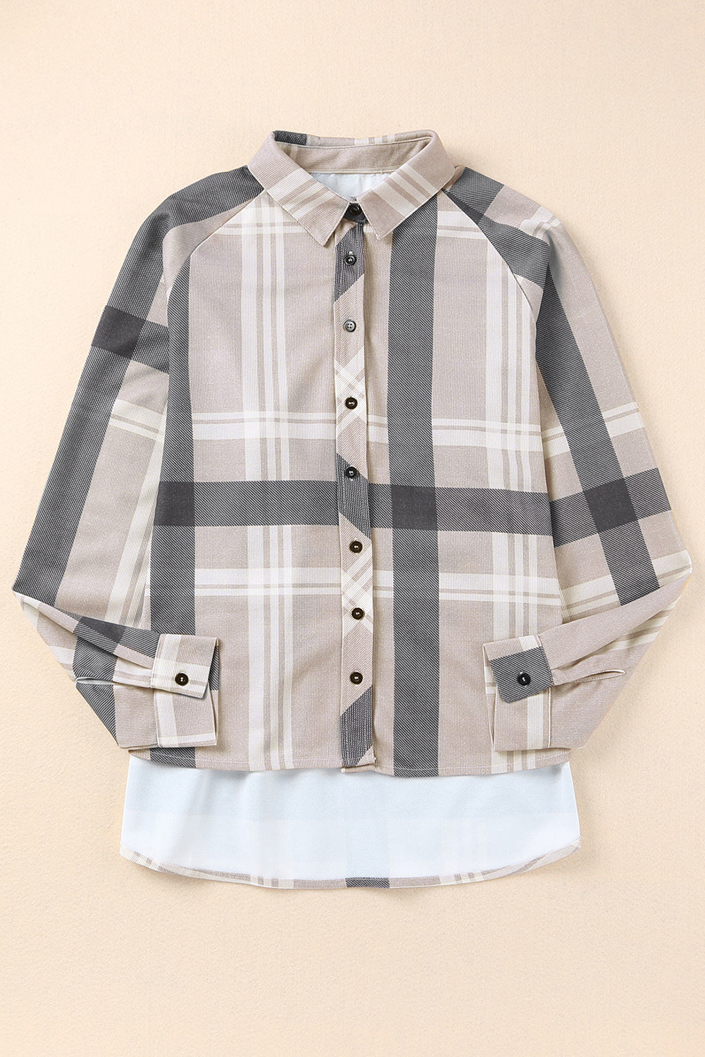 Introducing the Khaki High Low Brushed Plaid Oversize Shacket. the perfect addition to your wardrobe.