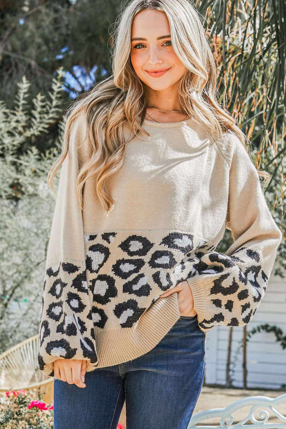 Khaki Leopard Patchwork Knitted Puff Sleeve Sweater