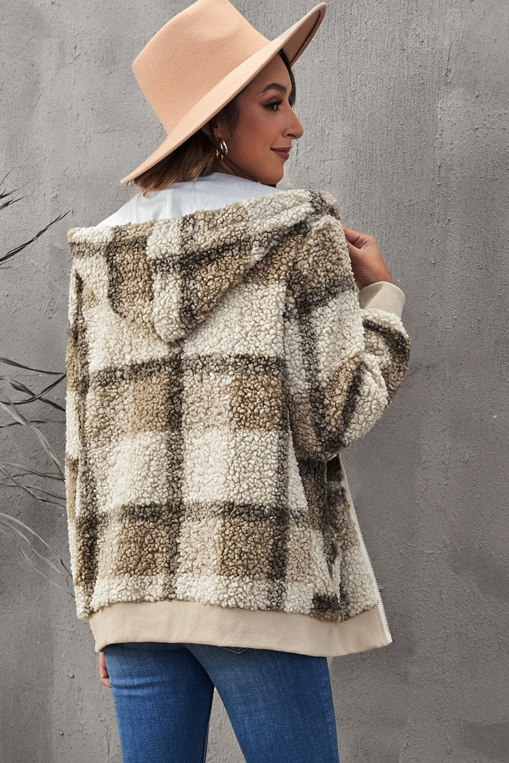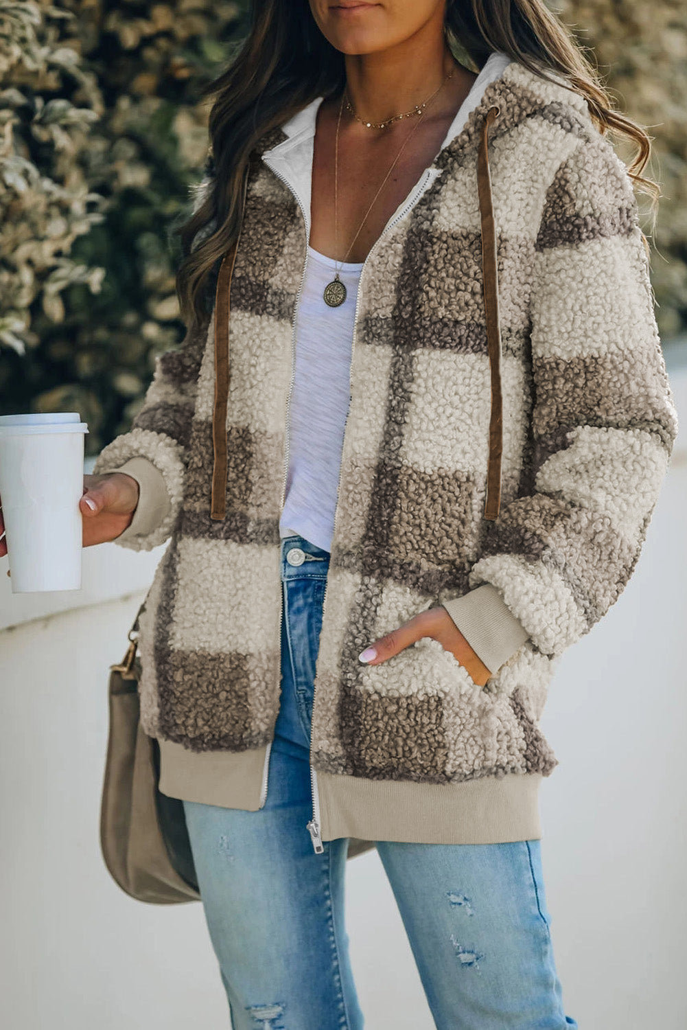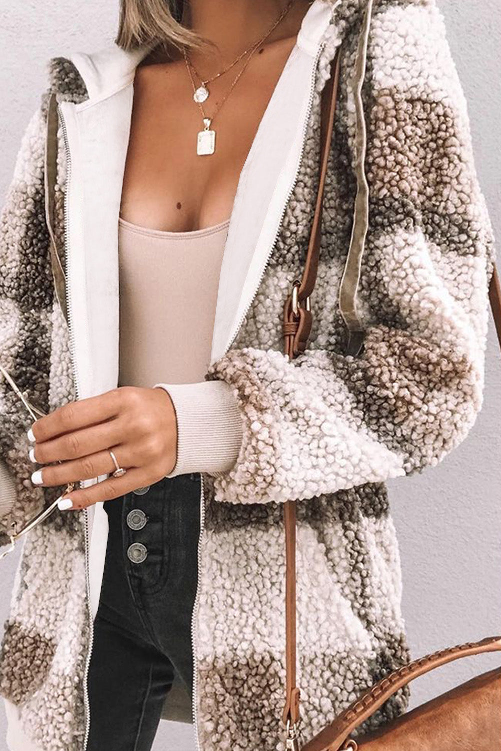 With its timeless style and cozy feel. the Khaki Plaid Print Zipper Fleece Hooded Coat is sure to become your go-to piece this season.