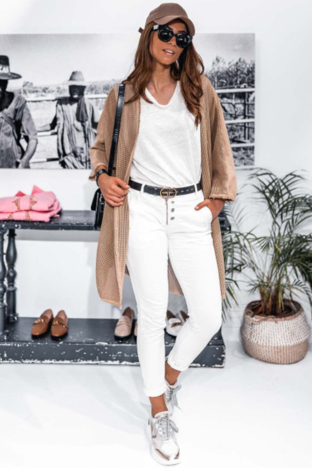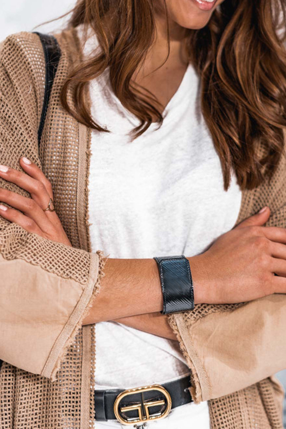 Embrace the understated elegance of the Khaki Pointelle Patchwork Rae Edge Cardigan. Thoughtfully designed and constructed. this 100% cotton piece merges style and comfort seamlessly.