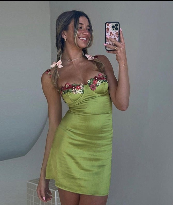 This dress combines the charm of lace with the convenience of suspenders. Perfect for any occasion. the knitted material provides ultimate comfort and a flattering fit. A playful take on a classic style. this dress will have you looking chic and carefree.