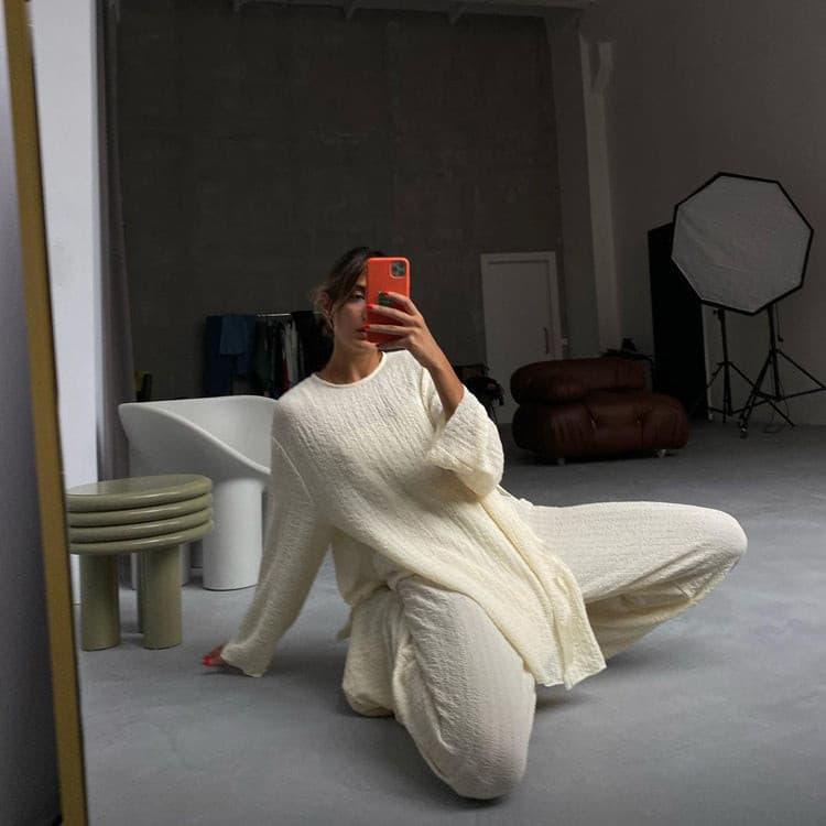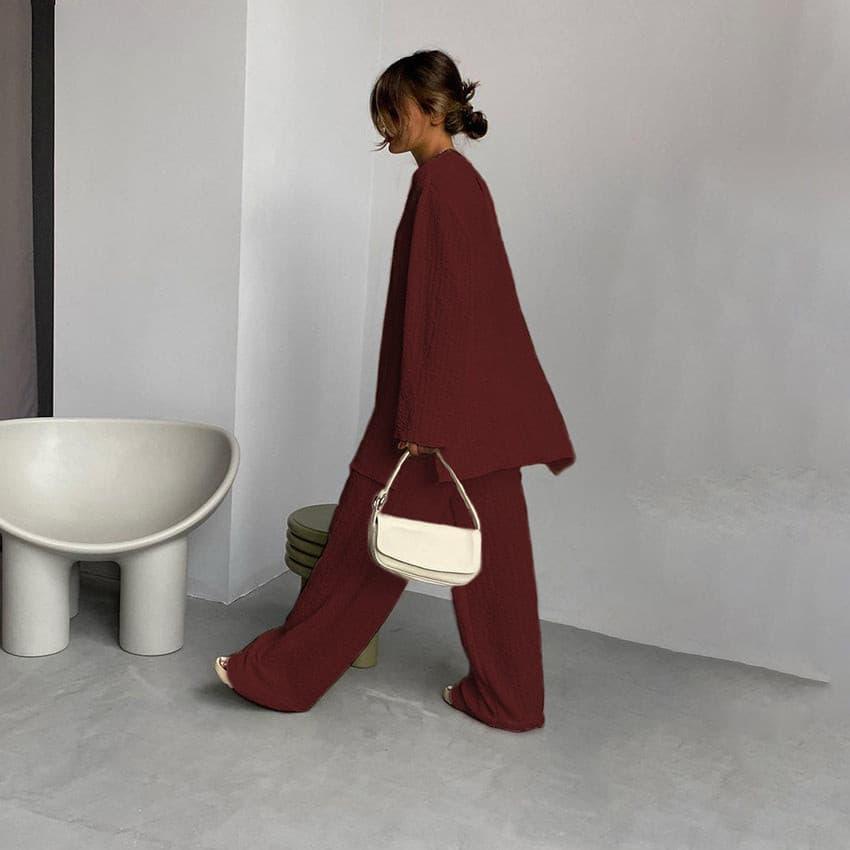 This stylish. long-sleeved casual suit is made with a lightweight. breathable crepe fabric that makes it perfect for all-day comfort and lasting wear. With a loose fit and drop shoulder design. this suit is designed to provide the best flattering silhouette. The perfect balance between style and comfort. this suit is the perfect choice for any occasion.