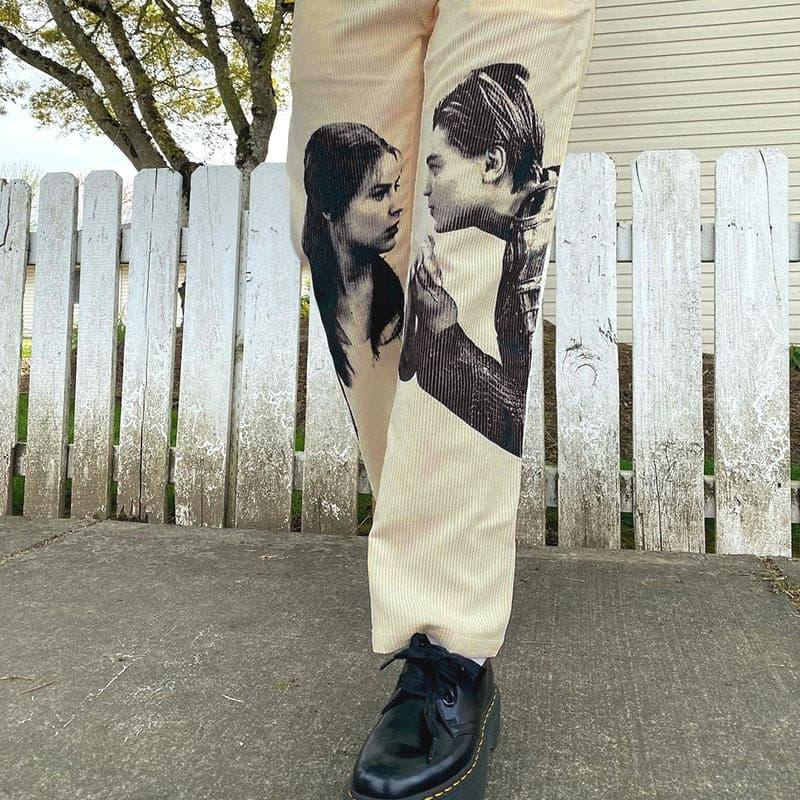 These straight-cut trousers offer a unique style statement for an effortless. chic look. Crafted with a soft. lightweight fabric. they feature a mid-rise waist and relaxed-fit legs for maximum comfort. With a bold love portrait print. they are the perfect choice for casual summer days. Plus. the hidden pockets provide the added convenience of extra storage.