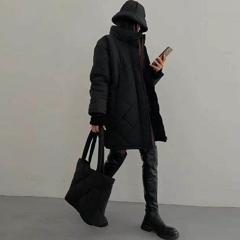 Making a stylish statement comes easy to this quilted jacket. Crafted with cotton blend and polyester. embellished with diamond details allover. featuring a funnel high neckline followed with press-stud closures and a zipper fastening. long sleeves adorned with elasticized ribbed cuffs. on-seam side pockets. a loose fit finished with a super-warm long length. Find more trendy women's long jackets or unique clothing in our boutique. and complete a fall and winter look with a ribbed mini dress and a pair of knee-high boots.