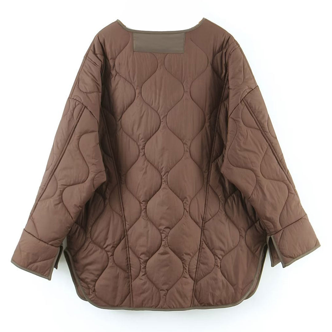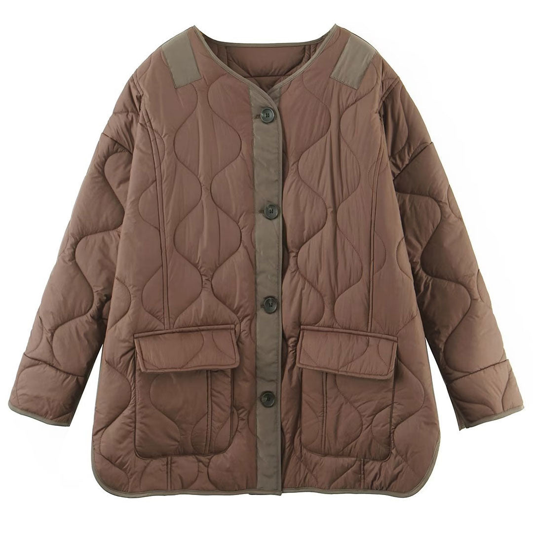 Don't be shy to follow your taste in fashion by choosing this contrasted puffer jacket. Made of blend polyester. embellished with wave quilt designs allover presented with contrasting color blocks. featuring a collarless neckline followed with a buttoned placket. dropped shoulders embodied with long sleeves and split cuffs. flap front pockets. a boxy & roomy silhouette adorned with a curved split hem. ending up in a long length. Find more trendy women's longline jackets or unique clothing in our boutique. and complete an attractive look with a sportive matching set.