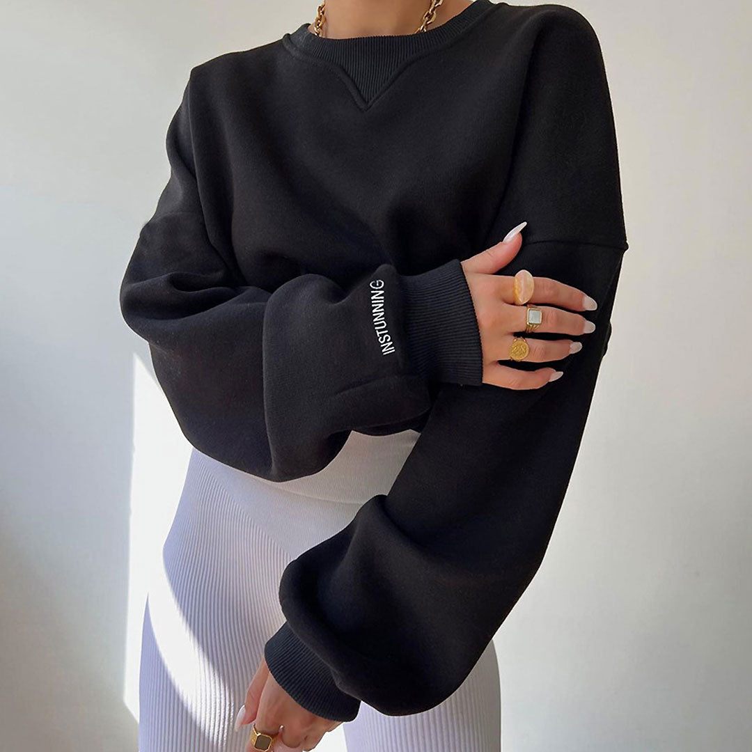 Keep it looking leisure and minimalist with this solid-color sweatshirt! Crafted with snug polyester and elastane. stand out in a loose fitting outlined with ribbed accents. featuring a crew neckline along with a curved seamed design. dropped shoulders framed with covered elastic cuffs and embroidered with contrasting embroidered letters. slightly fleeced lining. a slip-on styling with a slightly long length. Find more trendy women's brushed sweatshirts or unique clothing in our boutique. and style it with a pair of skinny pants.