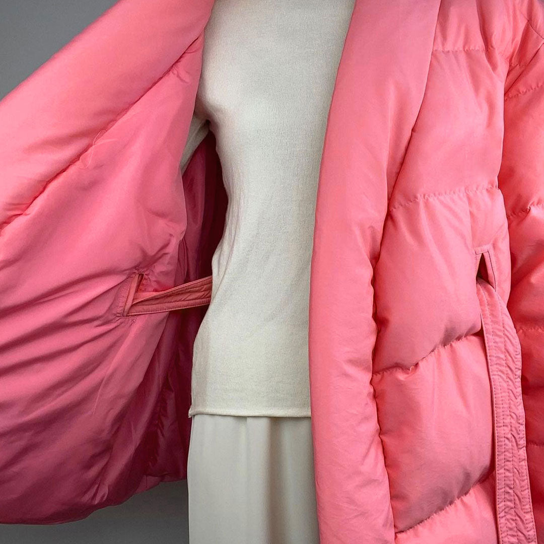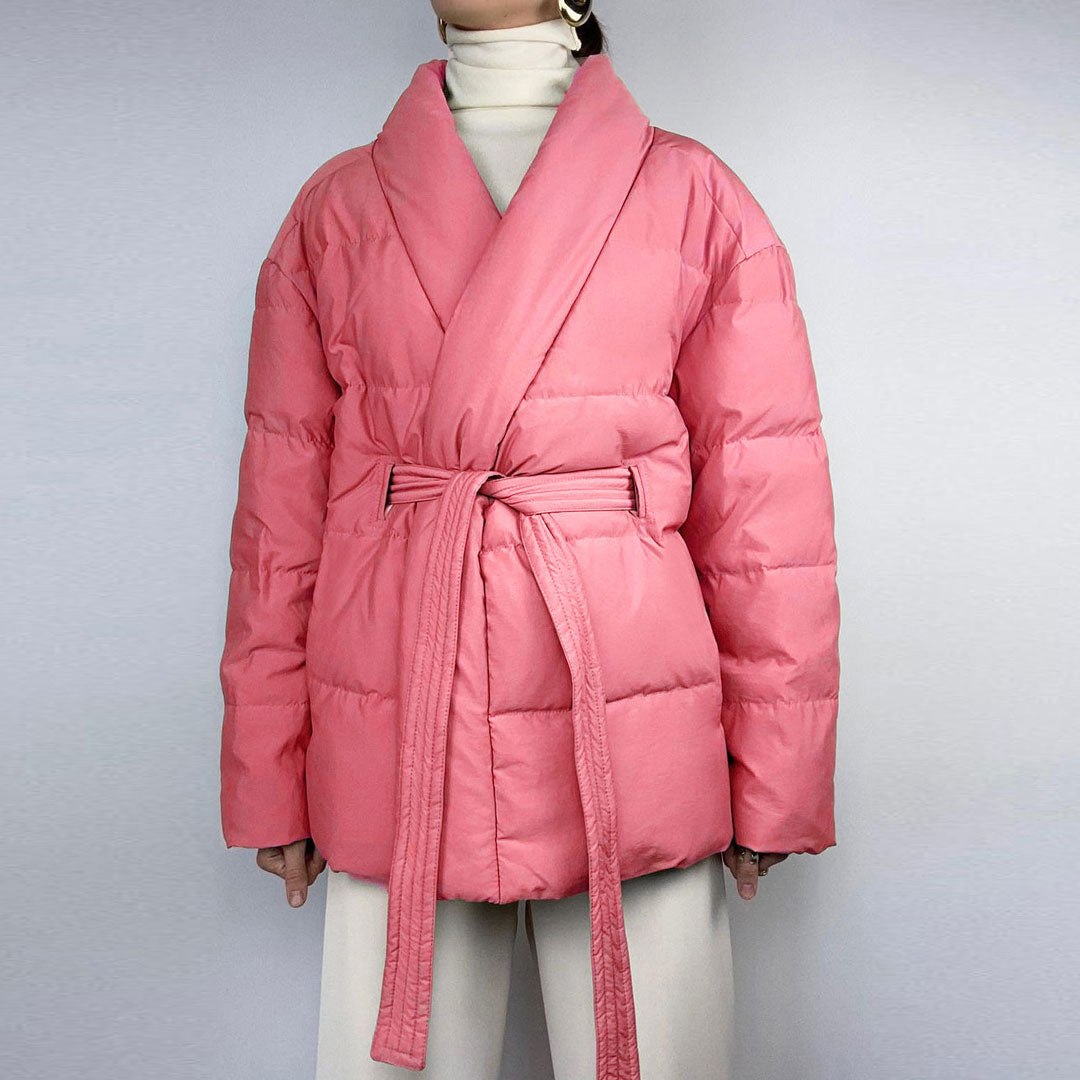 Oversized Shawl Collar Long Sleeve Belted Puffer Jacket - Coral Pink