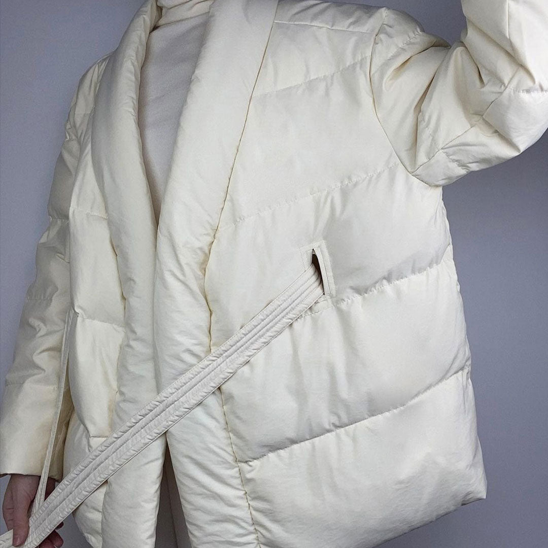 We are absolutely. positively obsessed with this quilted jacket. Made of cotton blend and polyester. embellished with an open front trimmed with a tonal self-tie waist belt. featuring a shawl collar neckline. dropped shoulders followed by long sleeves. quilting details throughout. an loose-fit silhouette finished with a slightly long length. Find more trendy women's long-sleeve jackets or clothing in our boutique. and wear it with a pair of wide-leg pants and a high-neck top.