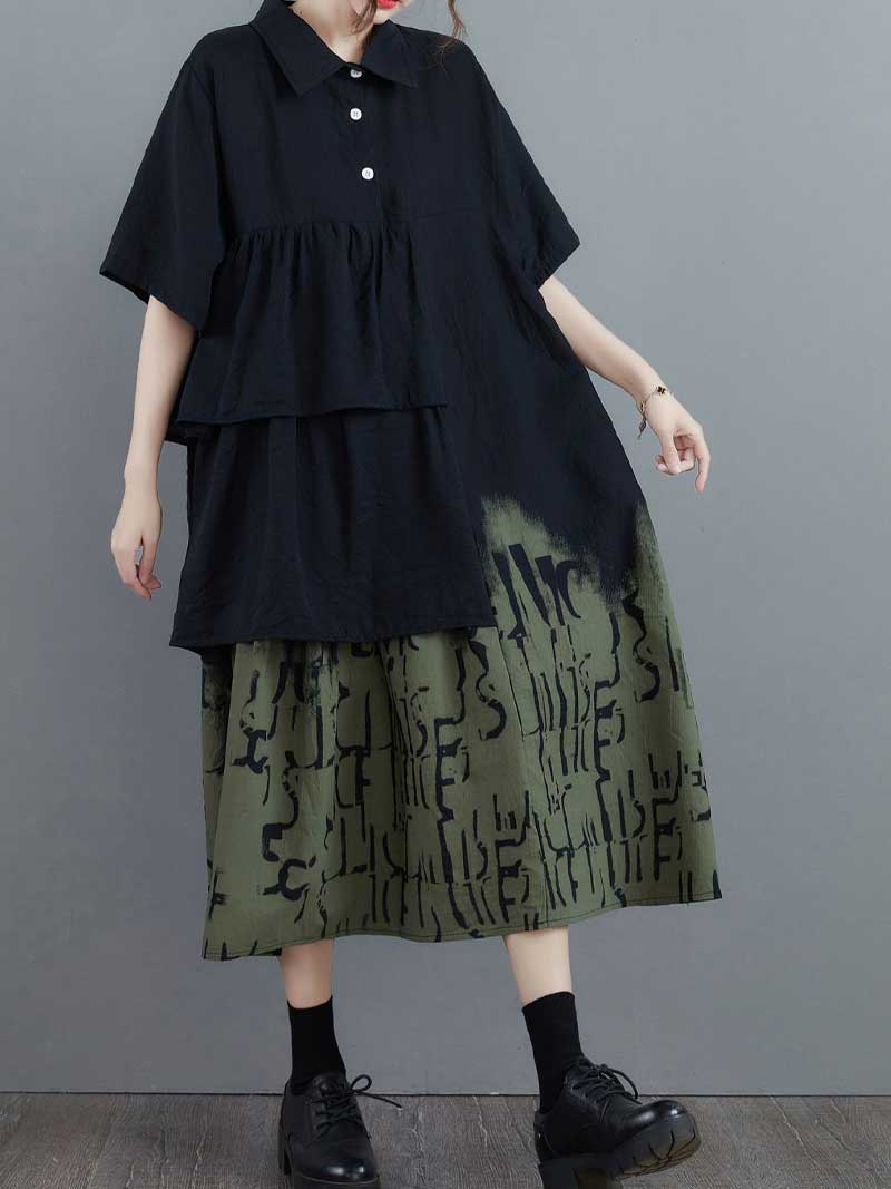 Check out our Pendulum Style Contrasting A-Line Shirt Dress! Made from a cotton blend. this figure-hugging dress comes in black and features a collar neckline. short sleeves. and a loose waist. The contrasting print adds a touch of fun and personality. while the A-line silhouette is ultra-flattering.