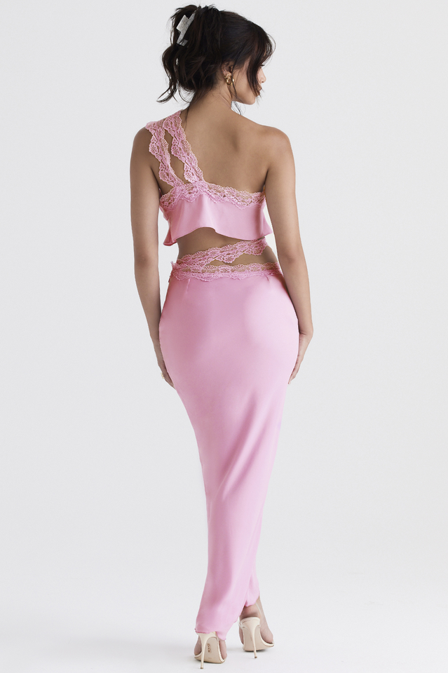 Sleek and ultra chic.The Lace Trim Maxi Skirt is designed to sit on the hips and elegantly skims your curves. falling to a flattering maxi hem. Cut from fluid silk georgette in delicate pink. Lace Trim Maxi Skirt features cutouts and delicate lace detailing.