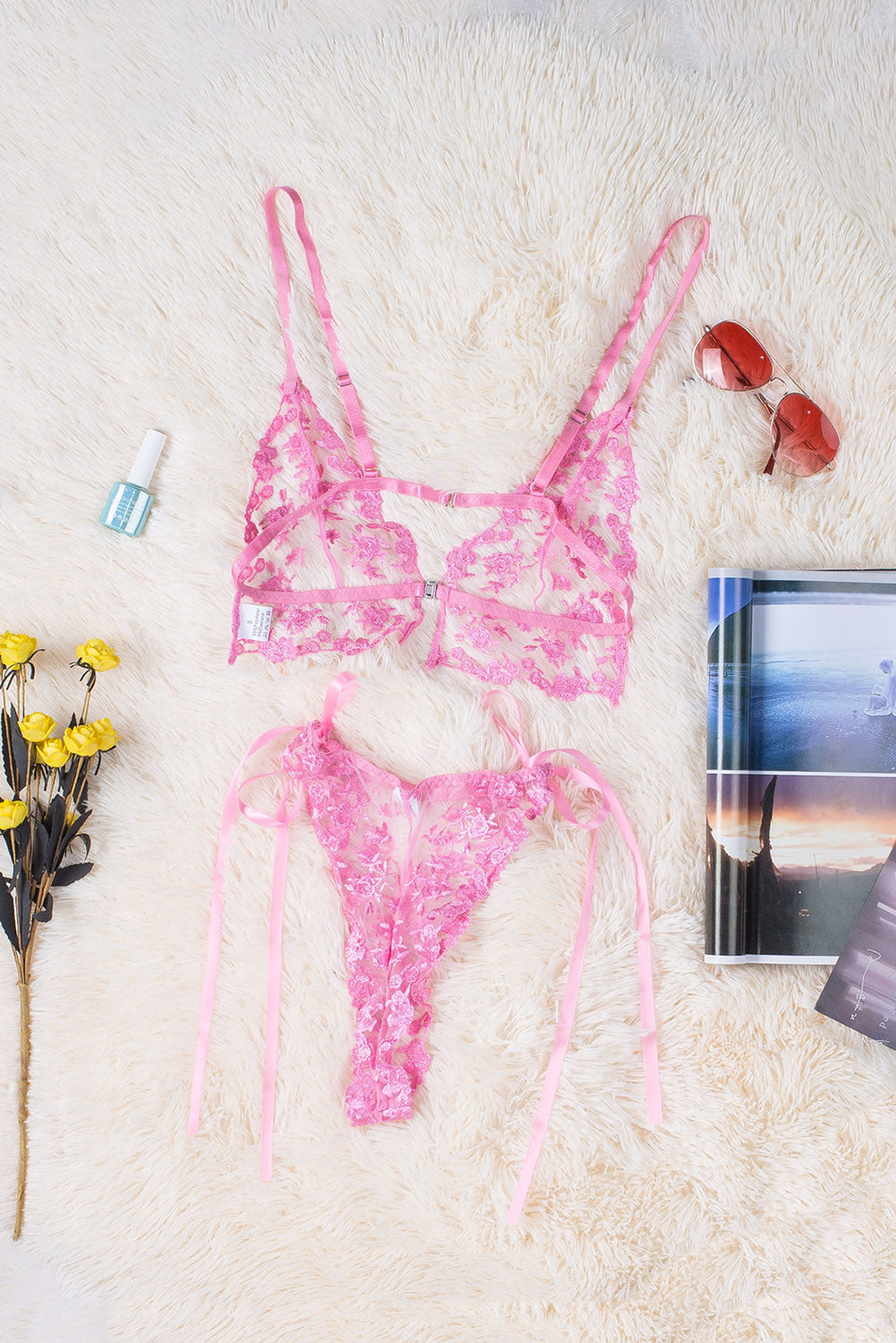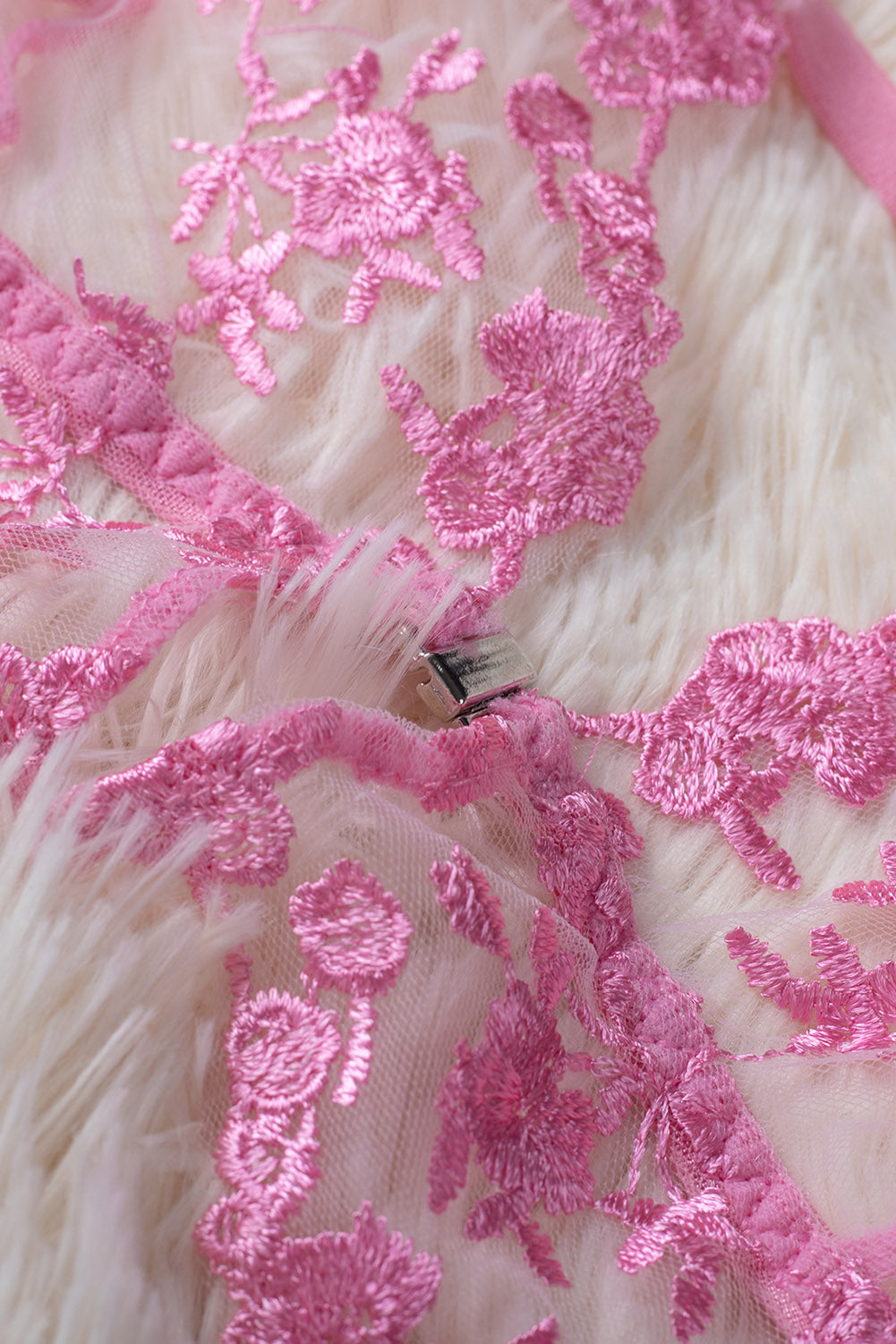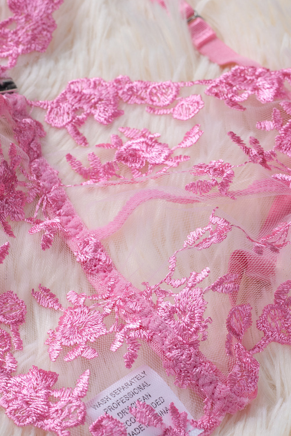 Whether you're looking for something to wear for a special occasion or just want to add a touch of femininity to your everyday look. this Pink Floral Embroidery Mesh Lace-Up Bra And Panty Set is the perfect choice.