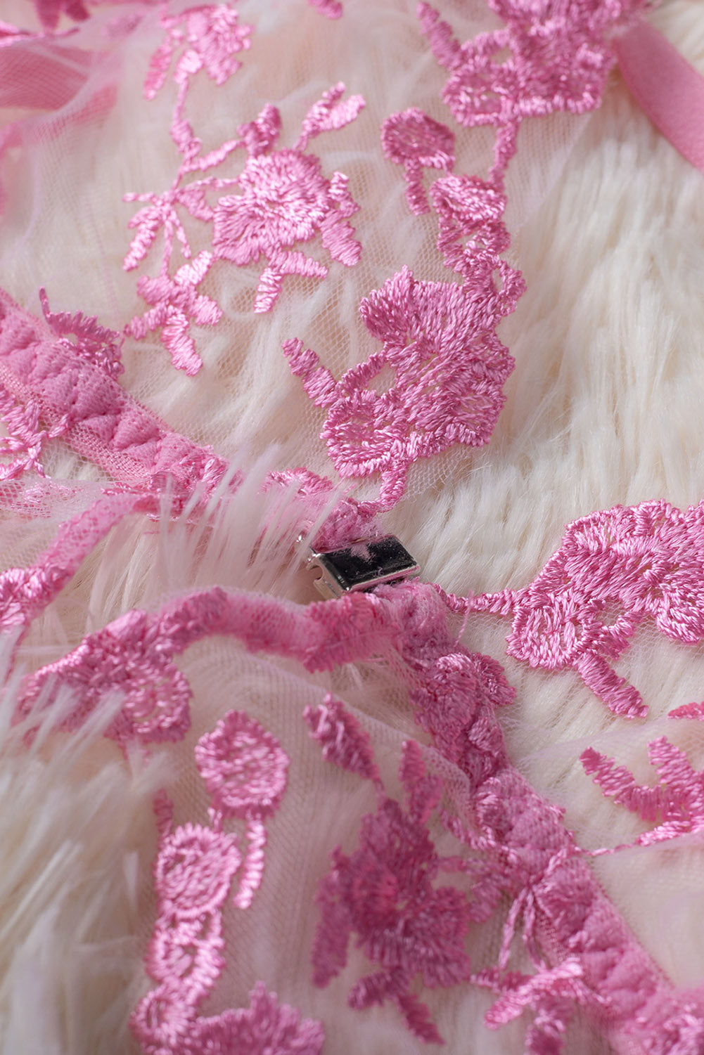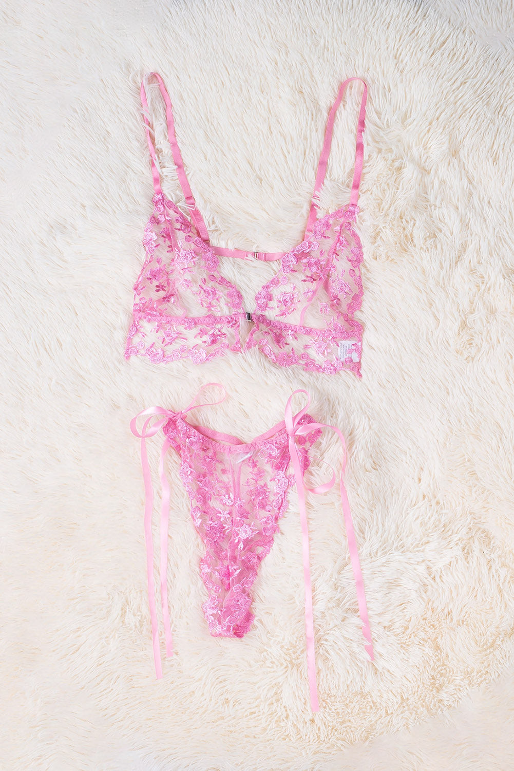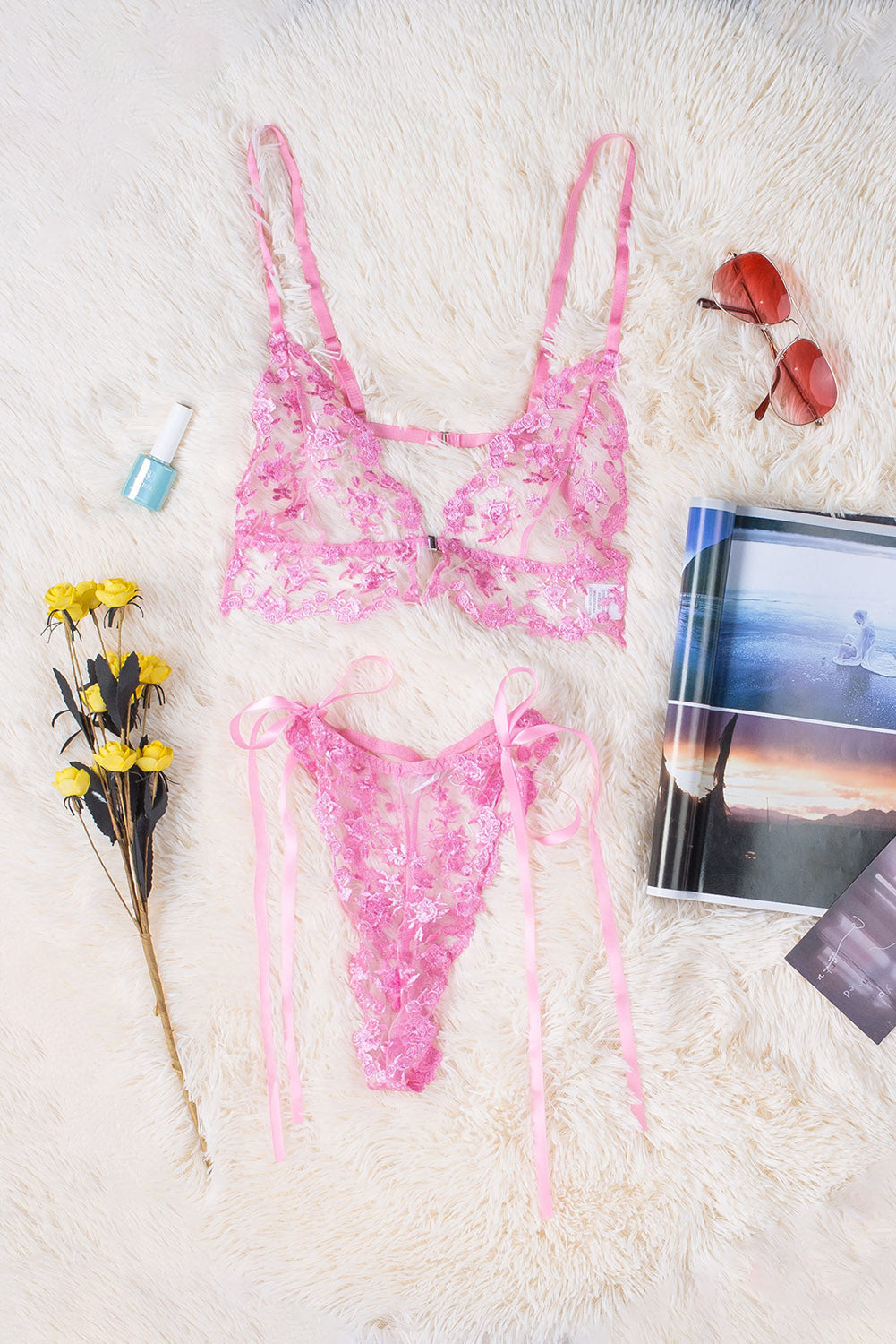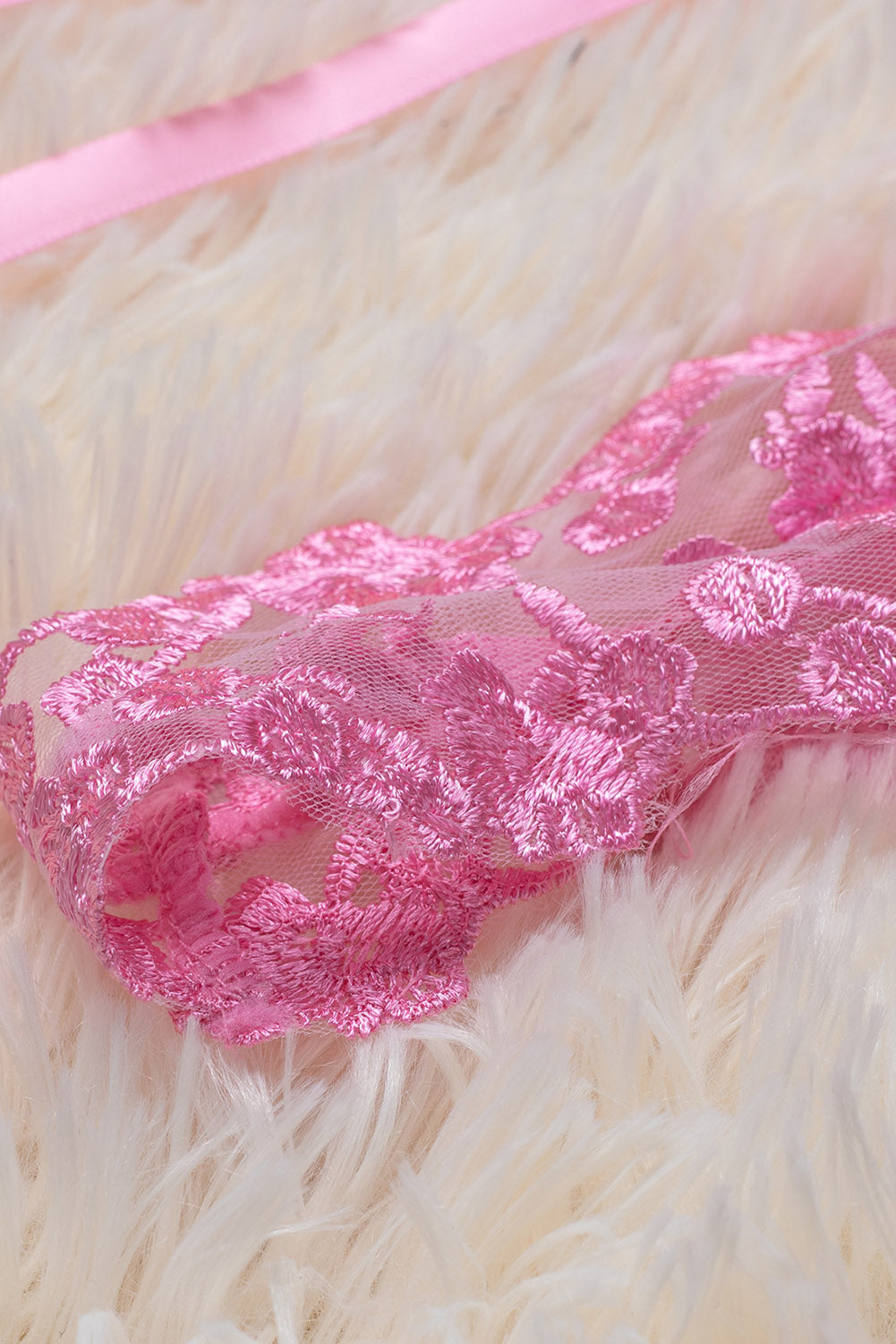 Whether you're looking for something to wear for a special occasion or just want to add a touch of femininity to your everyday look. this Pink Floral Embroidery Mesh Lace-Up Bra And Panty Set is the perfect choice.