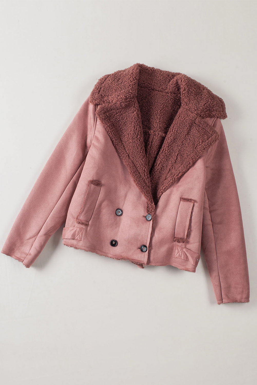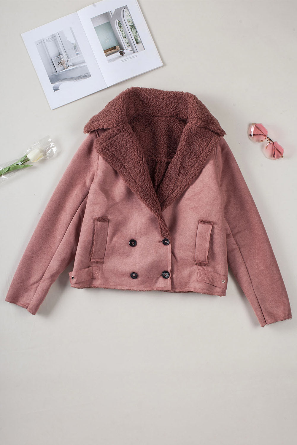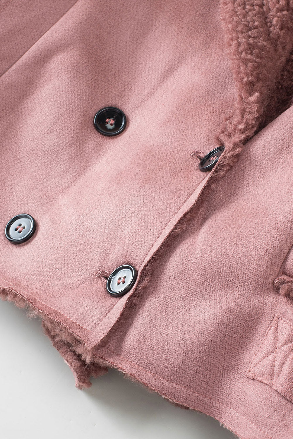 Shop now and add a touch of sophistication to your wardrobe with the Pink Plush Lining Suede Cropped Double Breasted Coat.