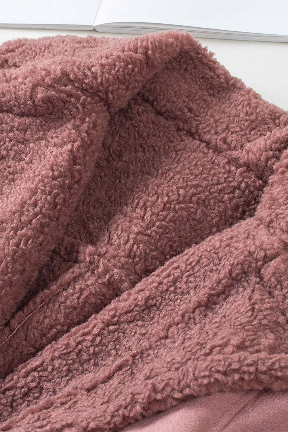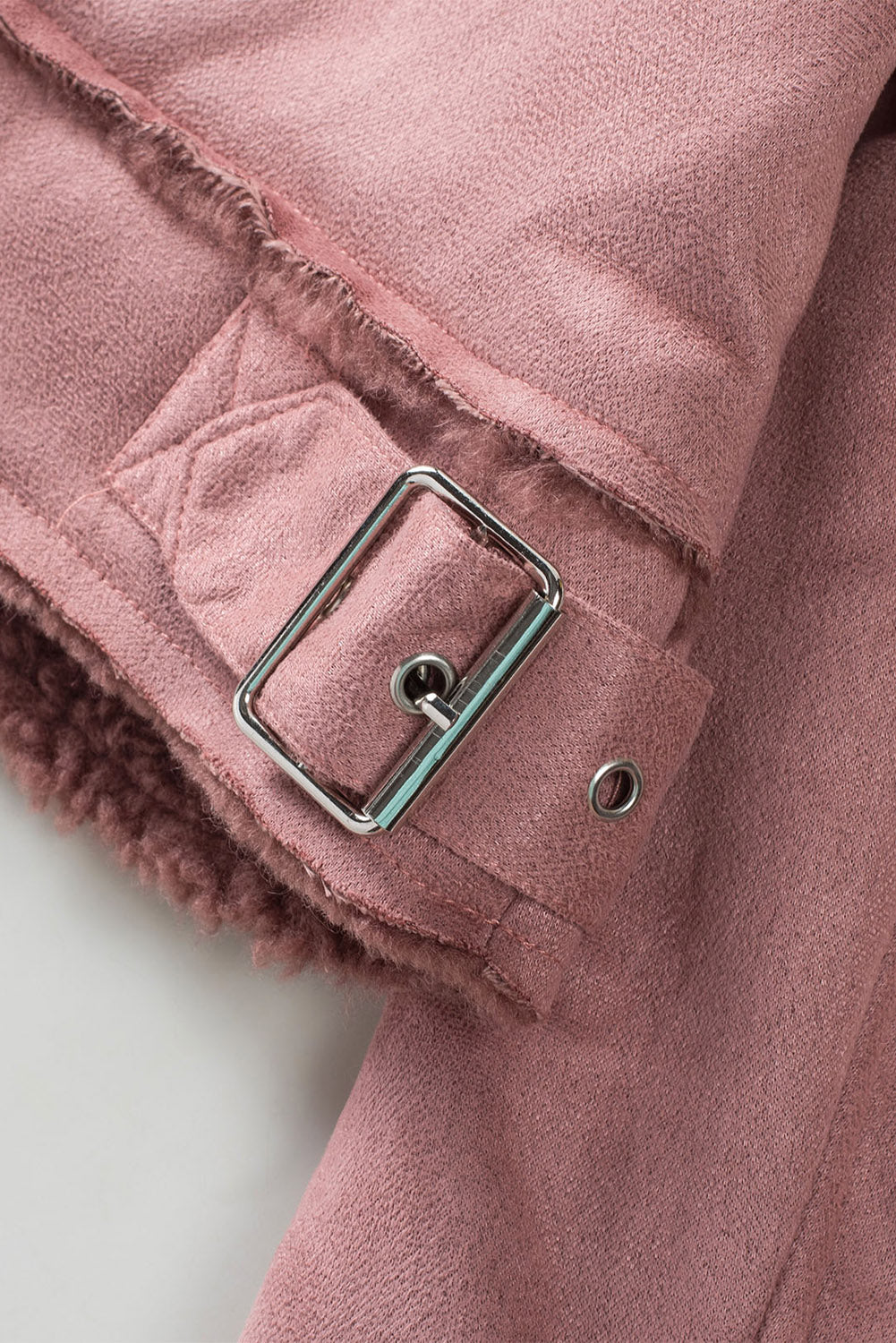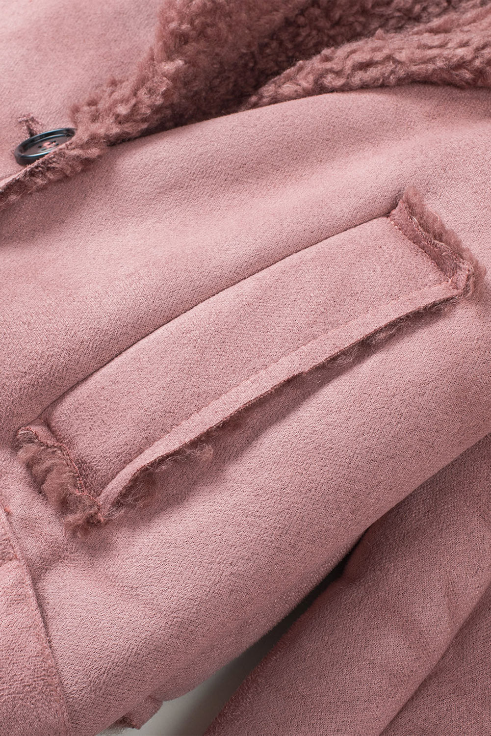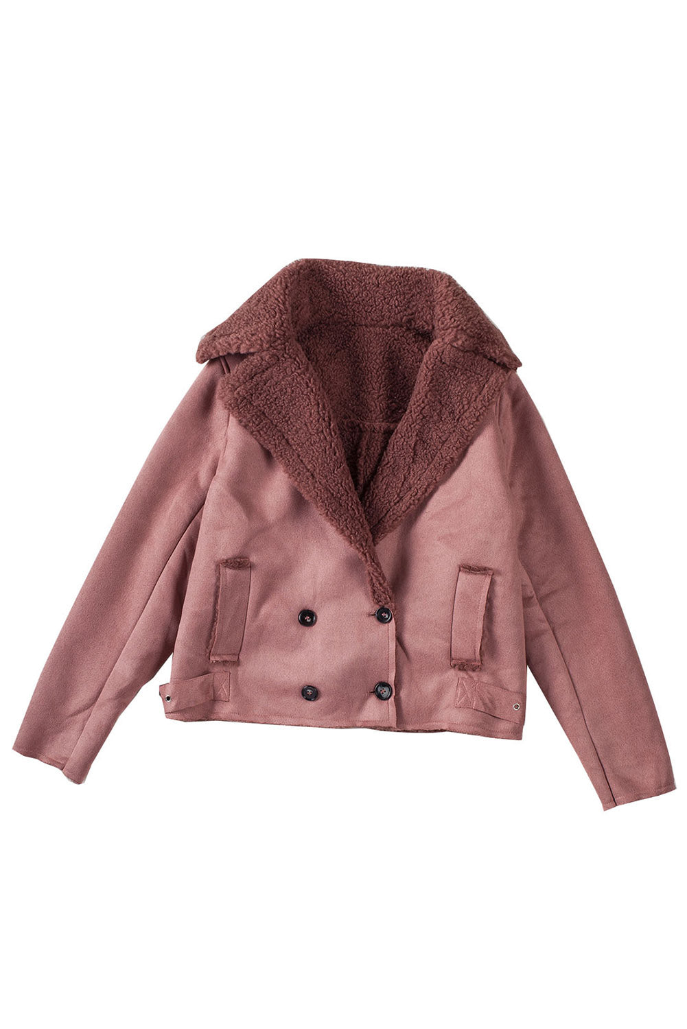 Shop now and add a touch of sophistication to your wardrobe with the Pink Plush Lining Suede Cropped Double Breasted Coat.