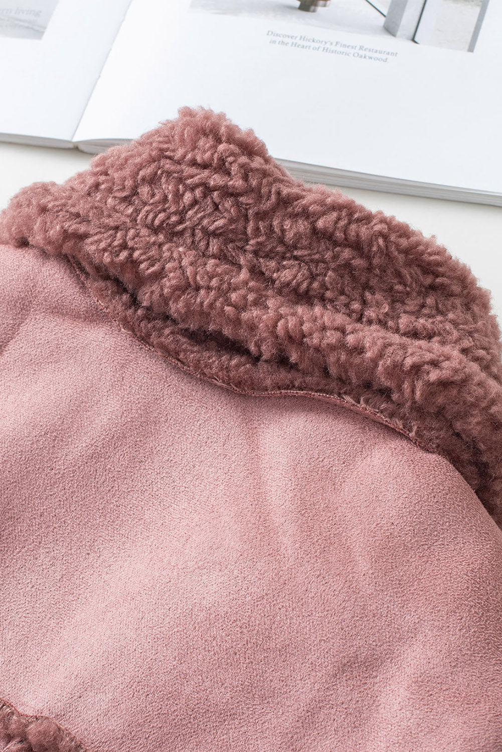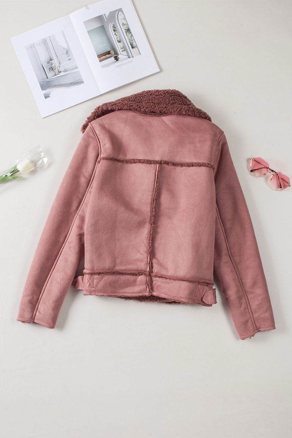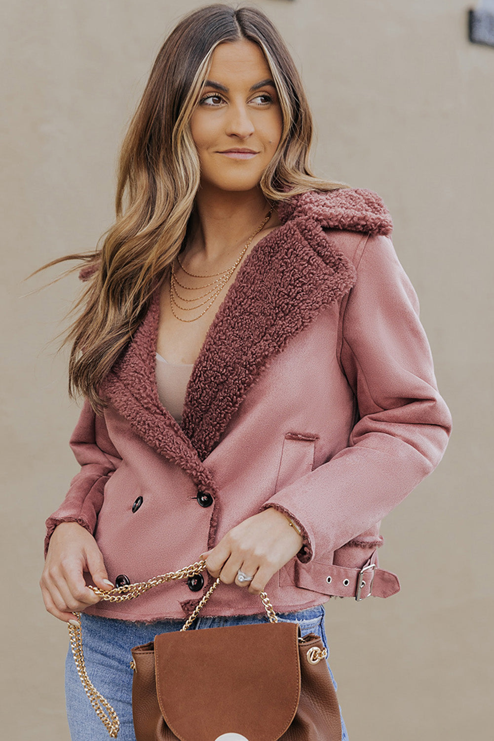 Introducing the Pink Plush Lining Suede Cropped Double Breasted Coat! This stylish and sophisticated coat is the perfect addition to any wardrobe.