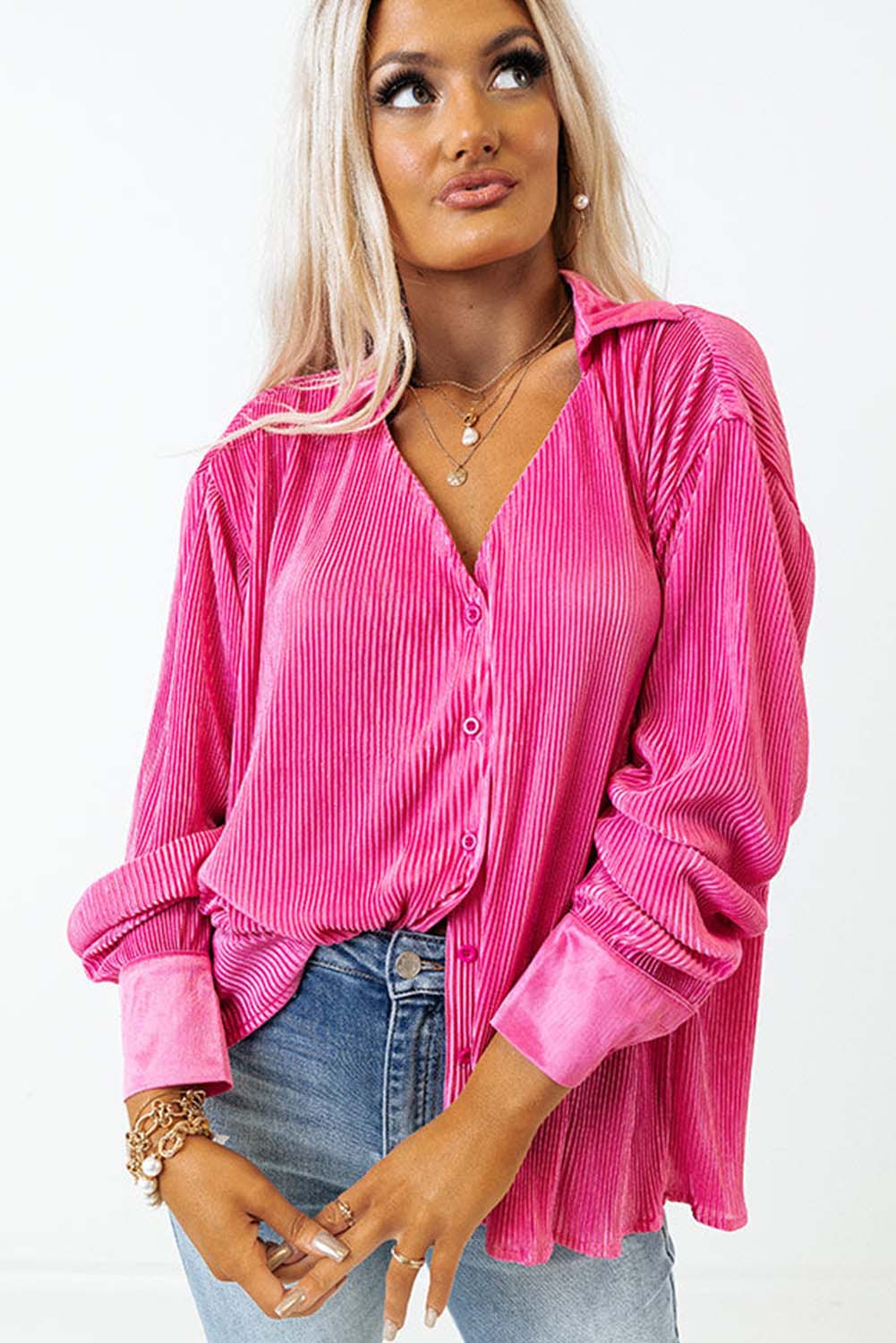 Introducing the Pink V Neck Collared Button Pleated Shirt—an elegant blend of sophistication and comfort. crafted from 100% premium polyester. This shirt seamlessly marries style and functionality. offering an upscale yet versatile addition to your wardrobe.