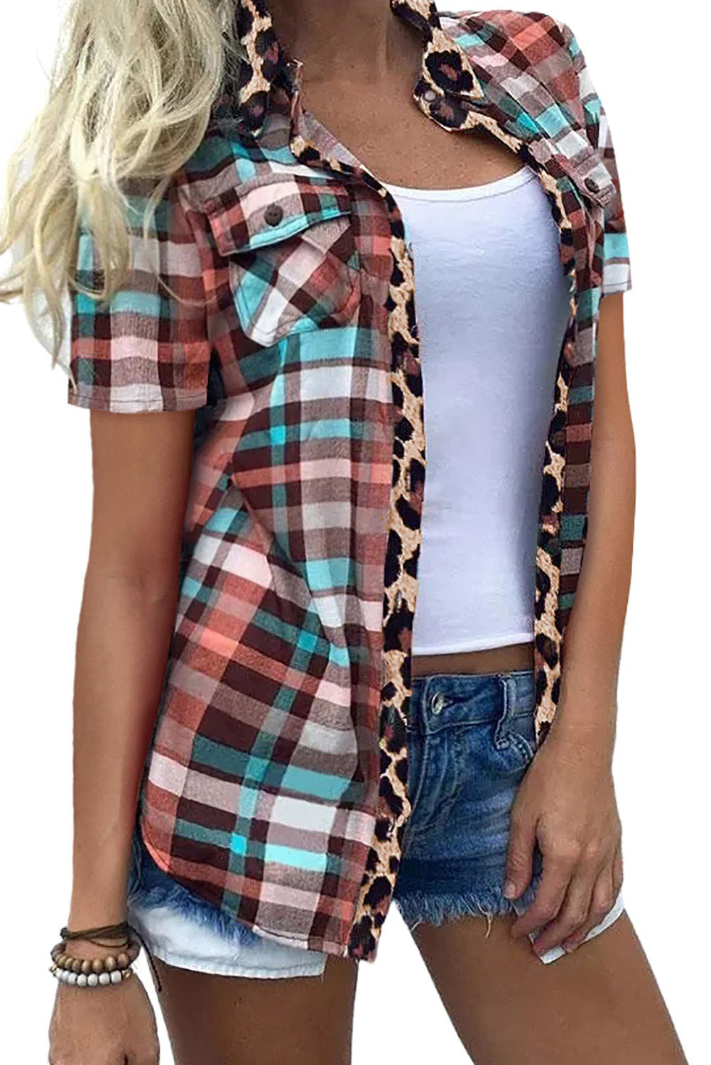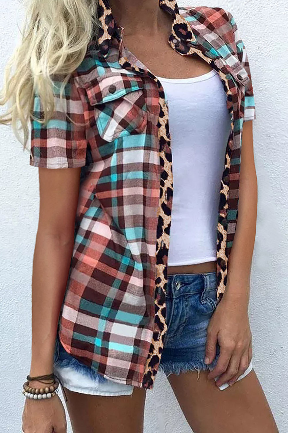 Introducing the Plaid Leopard Patchwork Pocket Short Sleeve Shirt. the perfect addition to your wardrobe.