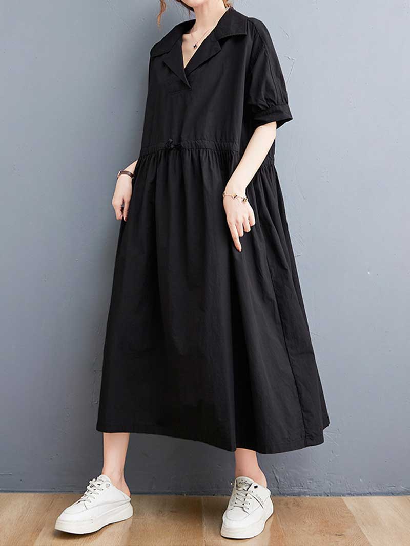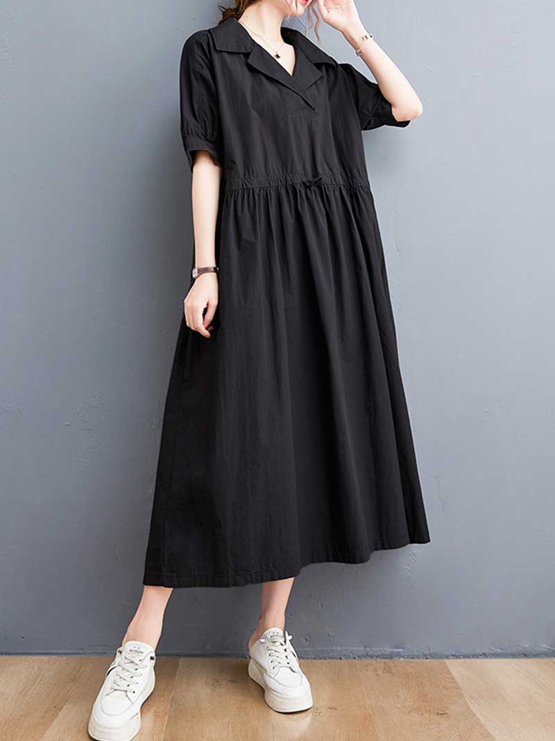 Our Plain Cotton Short Sleeve A-Line Dress! Made from 100% cotton. this dress is soft. breathable. and comfortable - perfect for summer days or brisk spring mornings. The collar-neck and high waist design are both timeless and flattering. while the short sleeves keep you cool and stylish. The Army-Green and Black color options are both versatile and chic. Whether you're headed to work. running errands. or meeting friends for lunch.