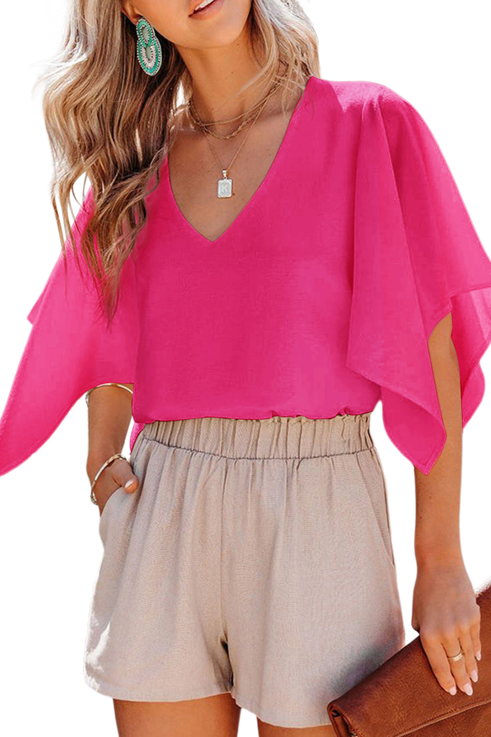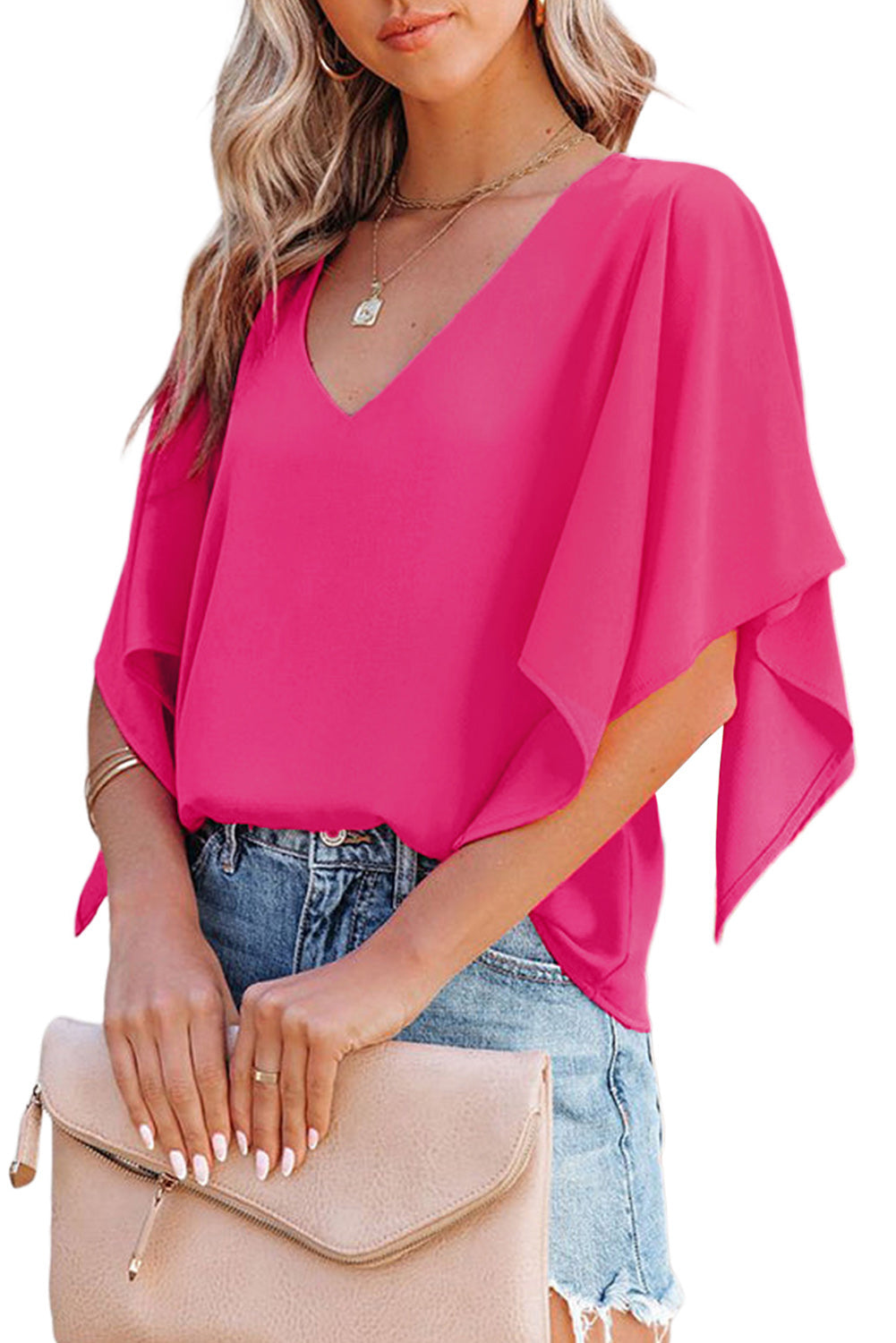 Be the envy of your friends with this gorgeous Plain Flounce Bell Sleeve V Neck Blouse.