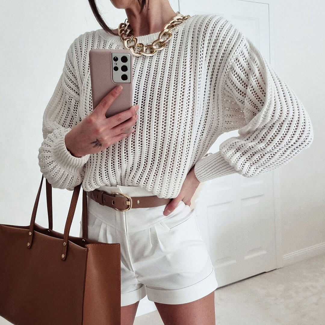 The perfect autumn & winter sweater is here! Crafted with blend acrylic. soft polyester and rib knit. embellished with pointelle detailing throughout. featuring a round neckline along with dropped shoulders. puffy long sleeves framed by banded cuffs. a roomy oversized fit finished with a regular length. Find more unique women's crochet sweaters or trendy clothing in our boutique. and style it with a pair of flare pants and a baguette bag for a classy winter look.