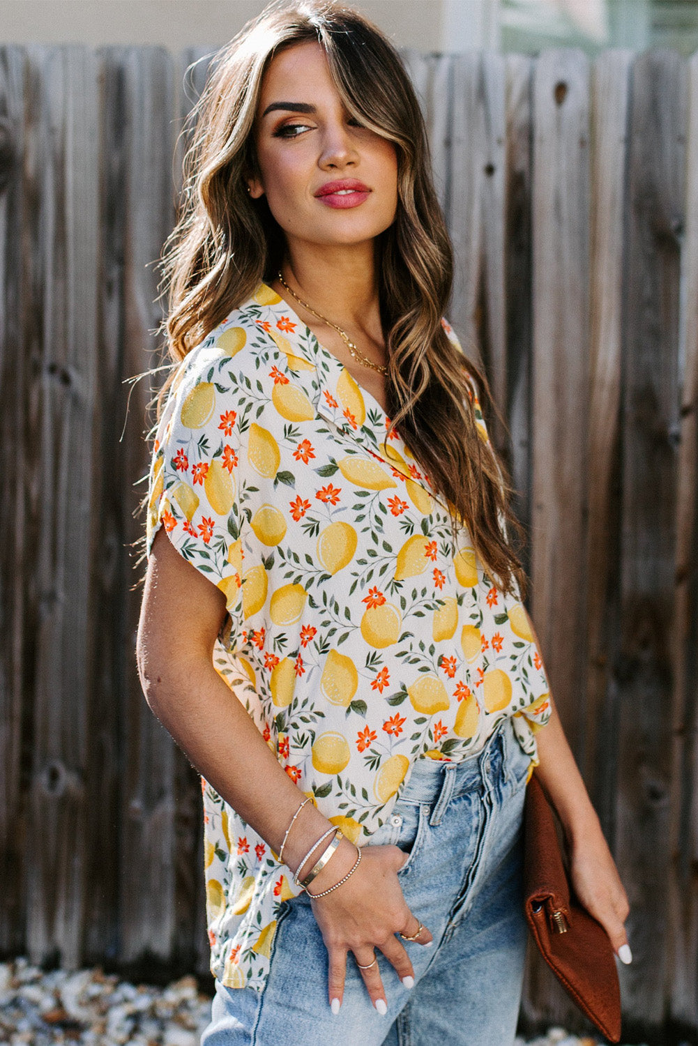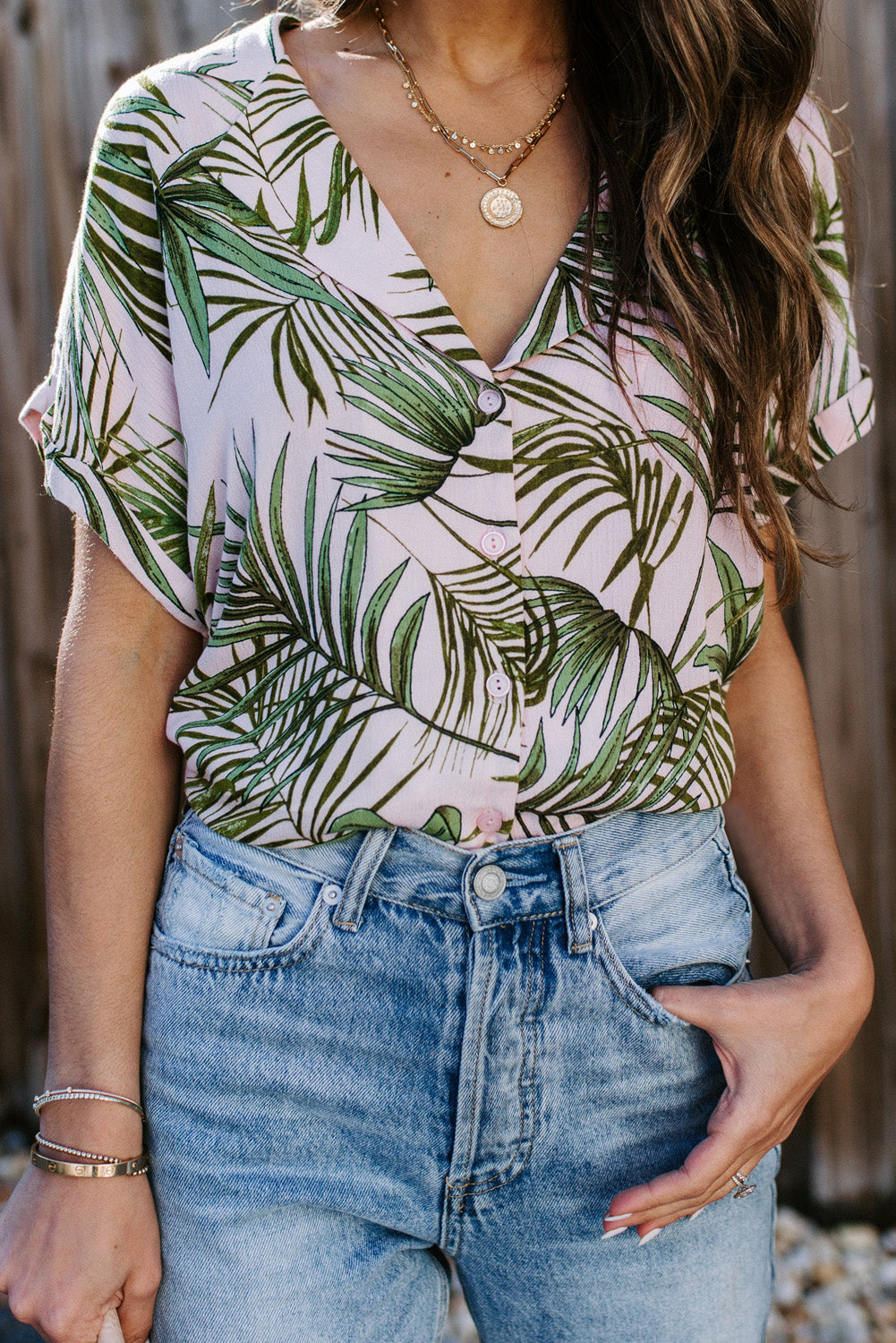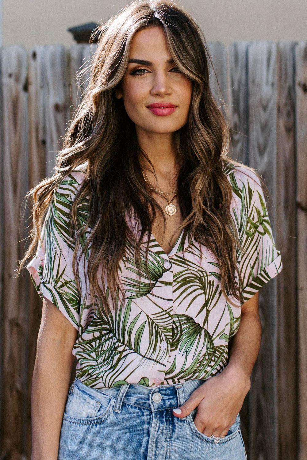 This Printed Button Front Top is the perfect addition to your wardrobe.