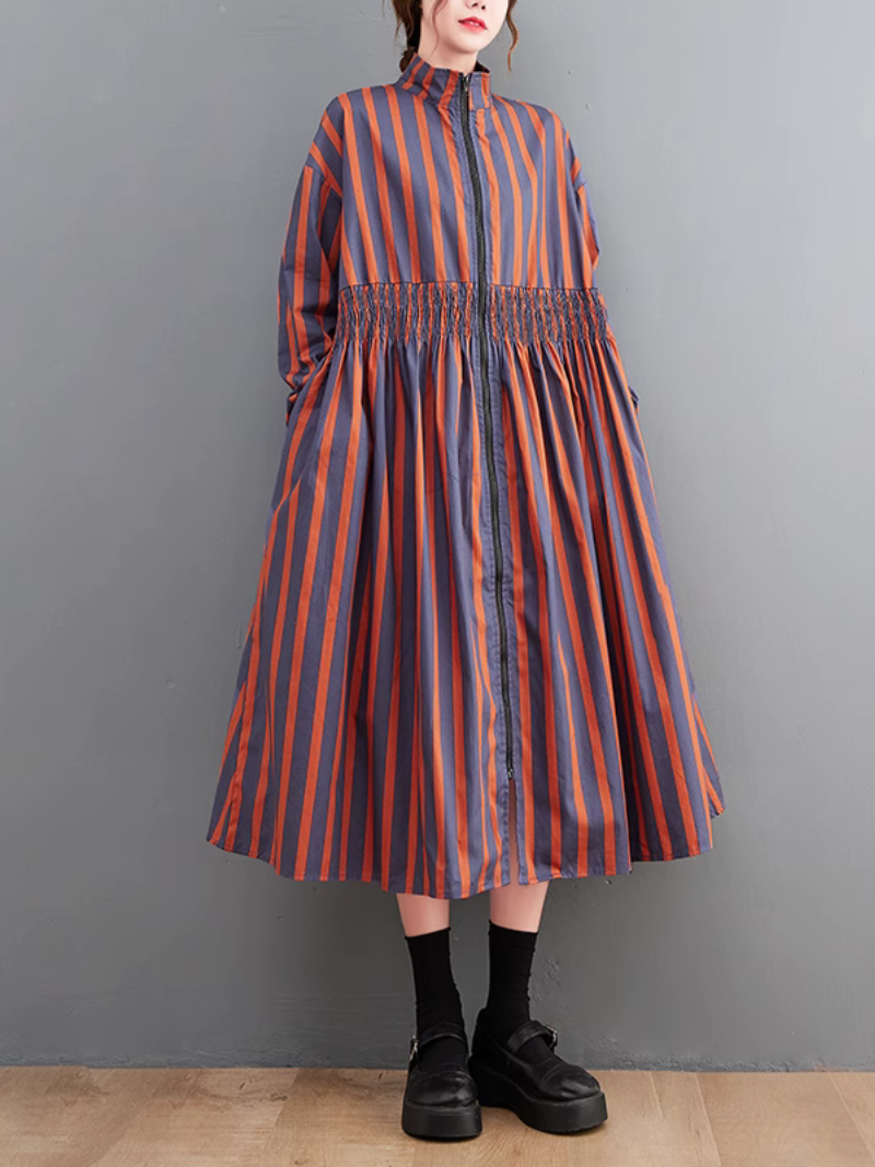 Experience contemporary fashion with our Printed Zipper Mid-Length Women's Striped A-line Dress. Crafted from a blend of 65% cotton and 35% polyester. it combines comfort and durability. Available in vibrant green and energetic orange. its striped print adds a dynamic flair. The long sleeves offer versatility. while side pockets infuse functionality. The dress features a convenient zipper for easy wear. Offered in a free size. its measurements include a length of 116cm. bust of 122cm. sleeves of 49cm. and shoulder width of 60cm. Elevate your style with this eye-catching A-line dress that perfectly balances trendiness and practicality.