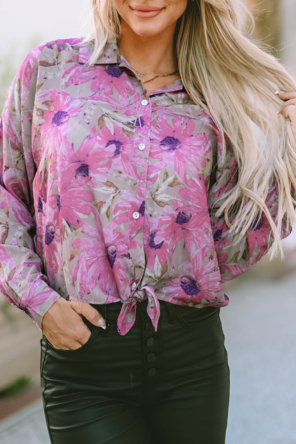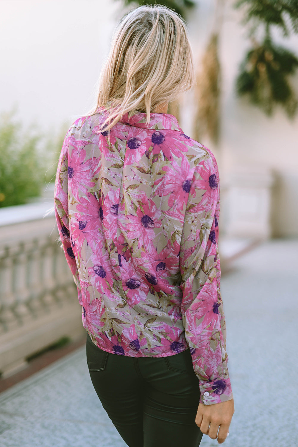 Purple Floral Print Button Up Puff Sleeve Shirt
