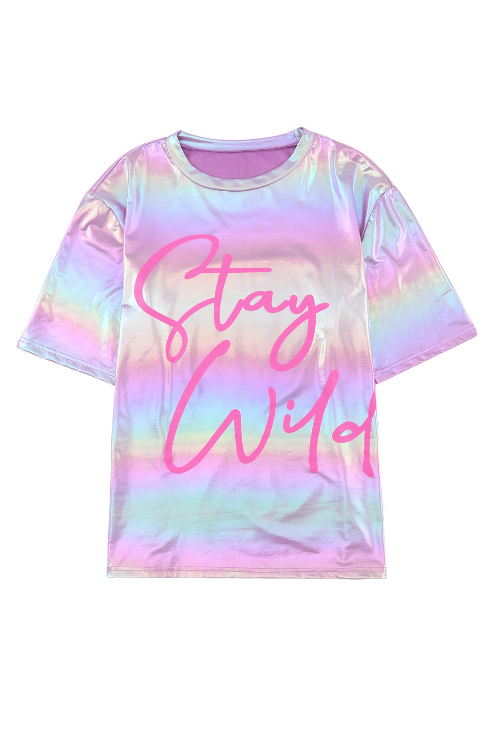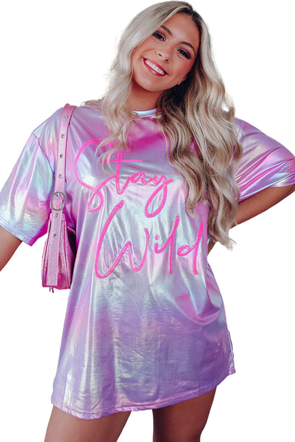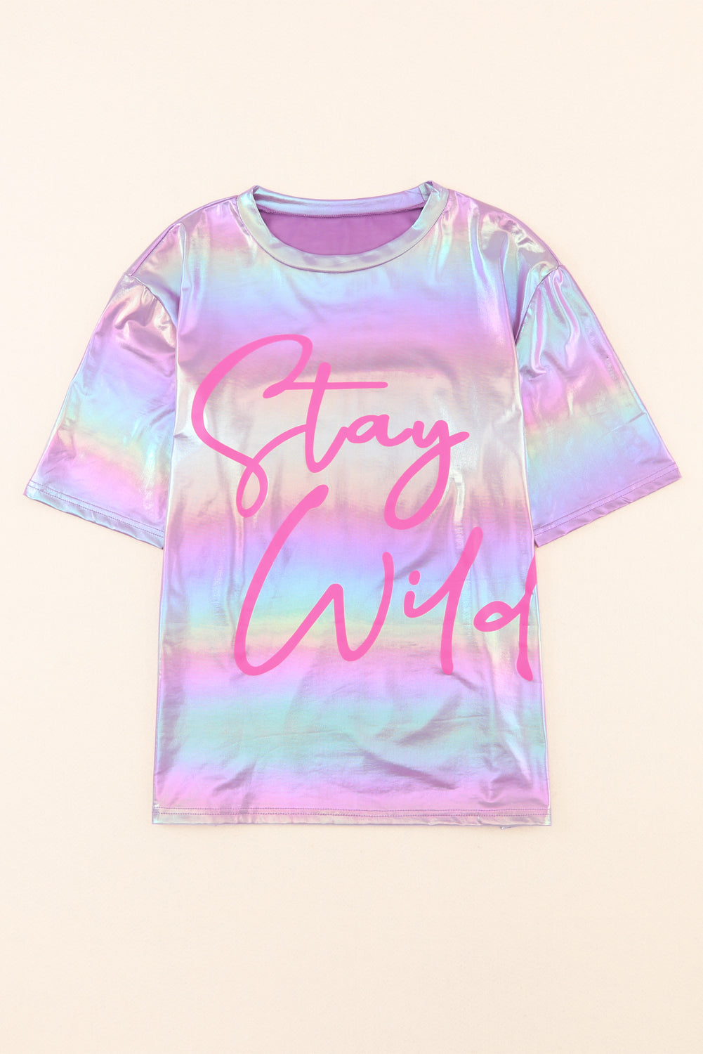 Make a bold statement in this Purple Shiny Iridescent Stay Wild Graphic Oversized Tee!